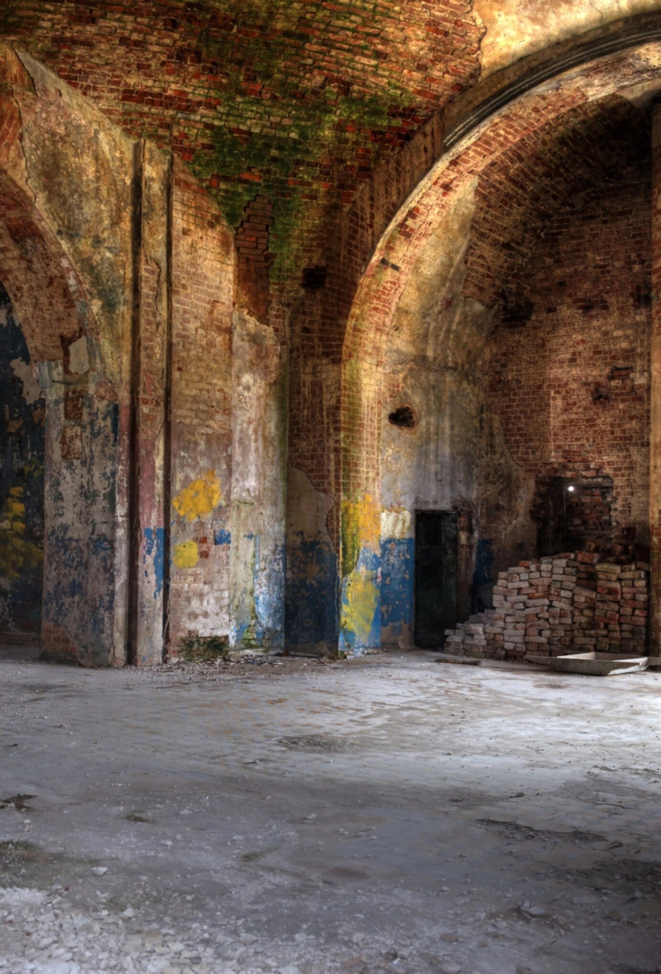 Величественные сводчатые потолки и массивные арки, поддерживаемые мощными колоннами, свидетельствуют о былом благолепии этого духовного места. Глубокие своды, характерные для русской храмовой архитектуры, создают особое пространство, некогда наполненное молитвой и пением. Ныне же на стенах и потолке видны многочисленные следы разрушения: осыпающаяся кладка, утраты штукатурного слоя, влажные потёки и следы плесени.