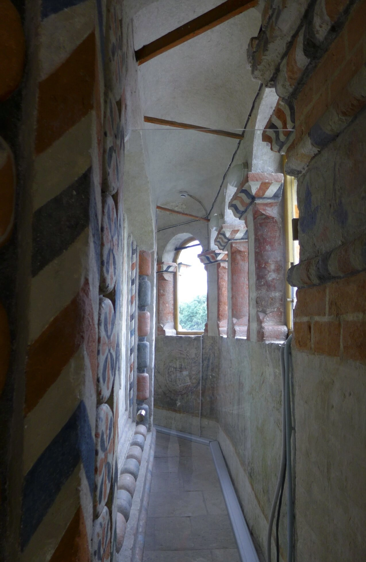 Стены прохода украшены характерным растительным орнаментом. Во второй половине XVII столетия галерею расписали темперными красками, изобразив пышные, цветущие узоры. В православной традиции такие росписи символизируют Райский сад — образ Небесного Иерусалима, к которому устремлена всякая человеческая душа. Орнамент включает в себя геометрические мотивы и полихромные детали, сочетающие красные, синие и белые тона, что соответствует цветовой палитре, исторически присущей убранству собора. Также видны круглые декоративные медальоны и резные кирпичные порталы, ведущие в церковные пространства.