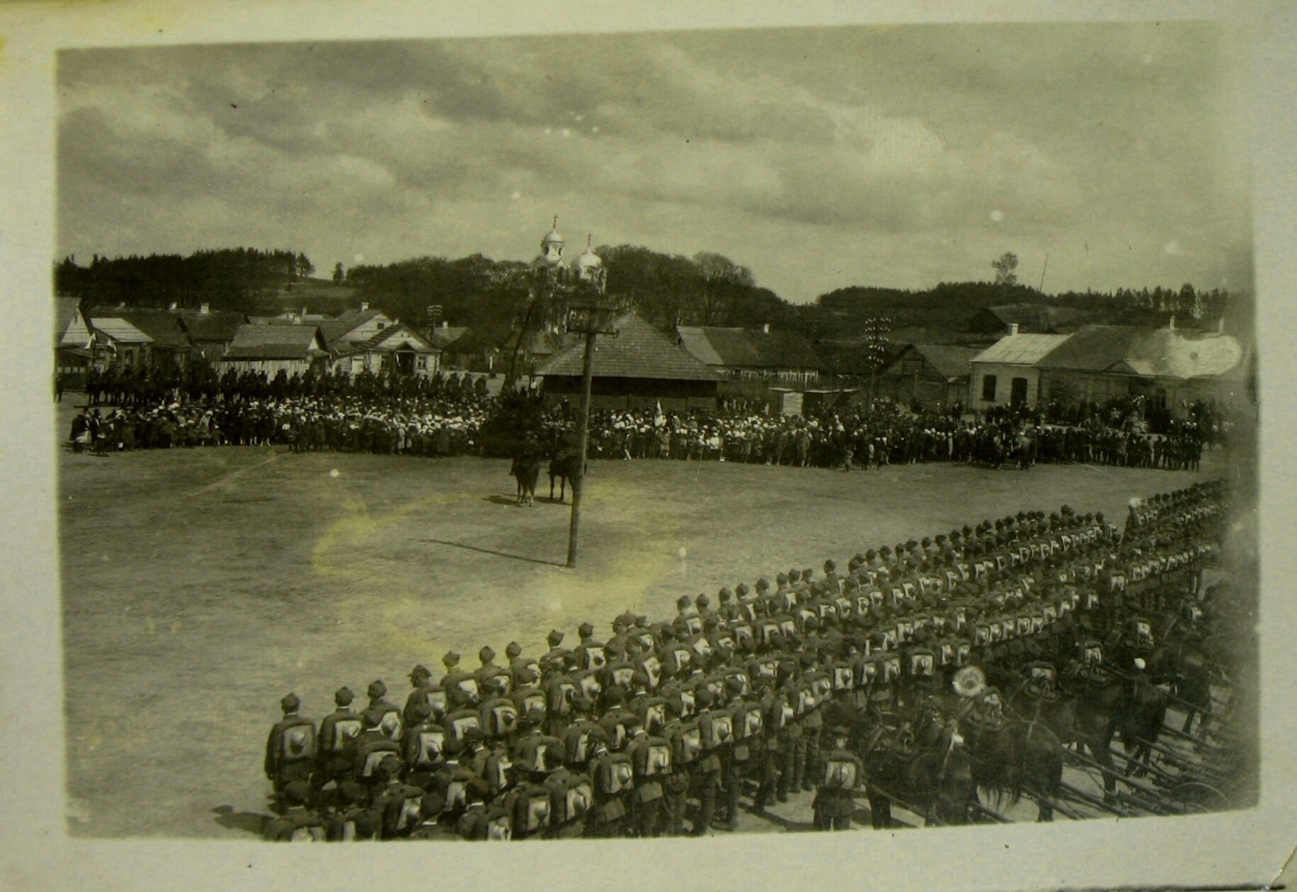 На площади, где происходит построение, установлен высокий столб, возможно, выполнявший функции фонарного или являвшийся элементом благоустройства. С обеих сторон площадь обрамляют деревенские постройки, а за войсковой колонной наблюдают местные жители, что придаёт сцене особый колорит и историческую достоверность. Данный снимок является ценным документальным свидетельством истории малых городов Белой Руси, переплетения военной и духовной жизни в непростой межвоенный период.