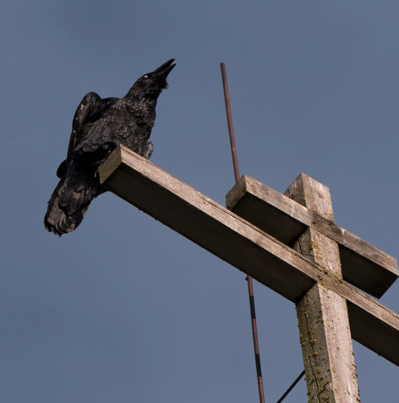 На представленной фотографии запечатлён обыкновенный ворон (Corvus corax), восседающий на вершине деревянного креста Успенской церкви Пресвятой Богородицы в древнем поморском селе Варзуга. Сия уникальная фотография сочетает в себе величие северной православной архитектуры и дикую природу Русского Севера.
