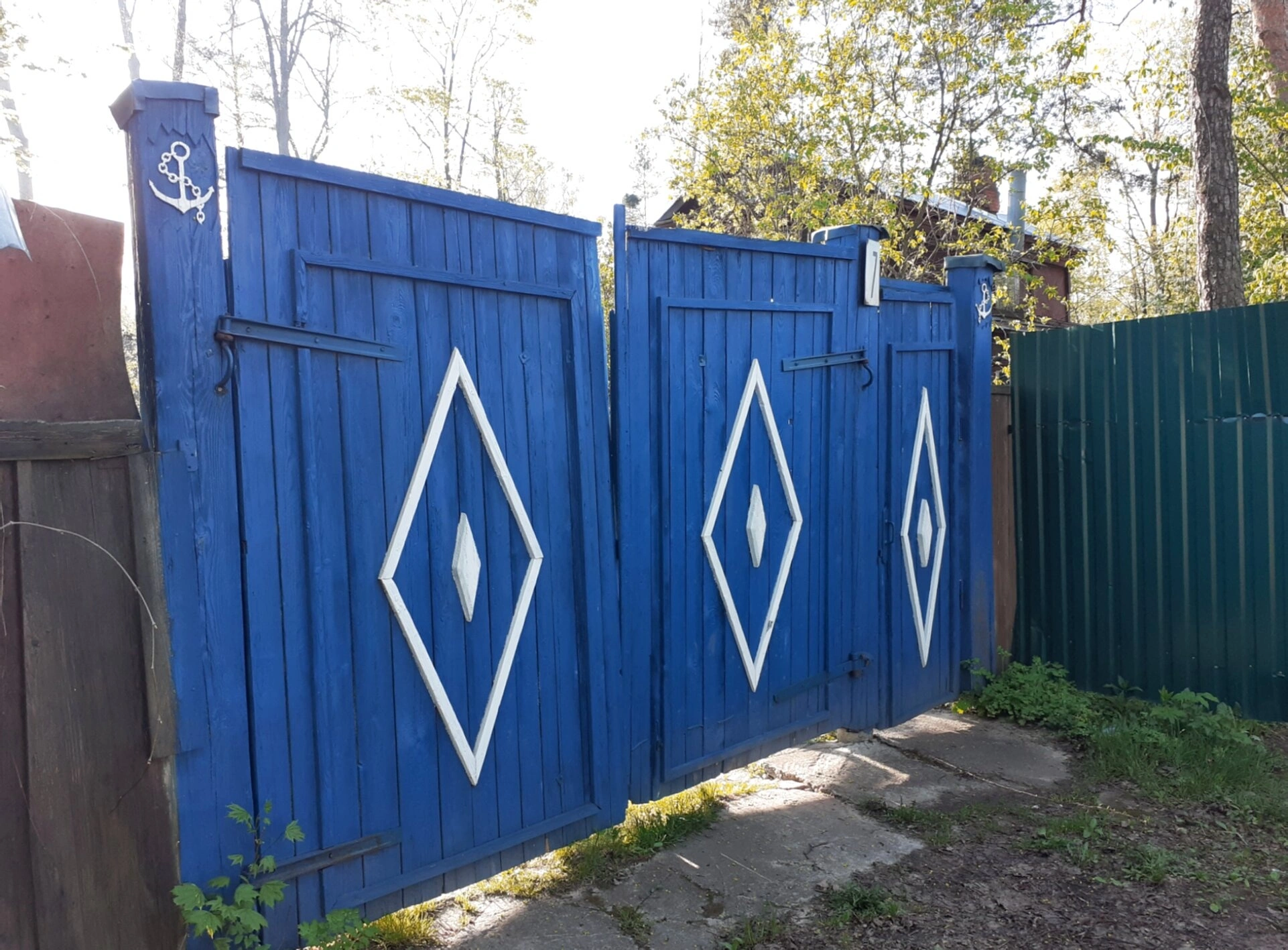 На представленной фотографии запечатлены входные ворота с калиткой, ведущие на территорию Церкви Великомученика Георгия Победоносца, расположенной в селе Алёшино Пушкинского района Московской области. Врата, выполненные из дерева и окрашенные в благолепный синий цвет, символизирующий небесную чистоту и Богородичную благодать, украшены белоснежными ромбовидными узорами, нанесёнными на створки ворот и калитку.