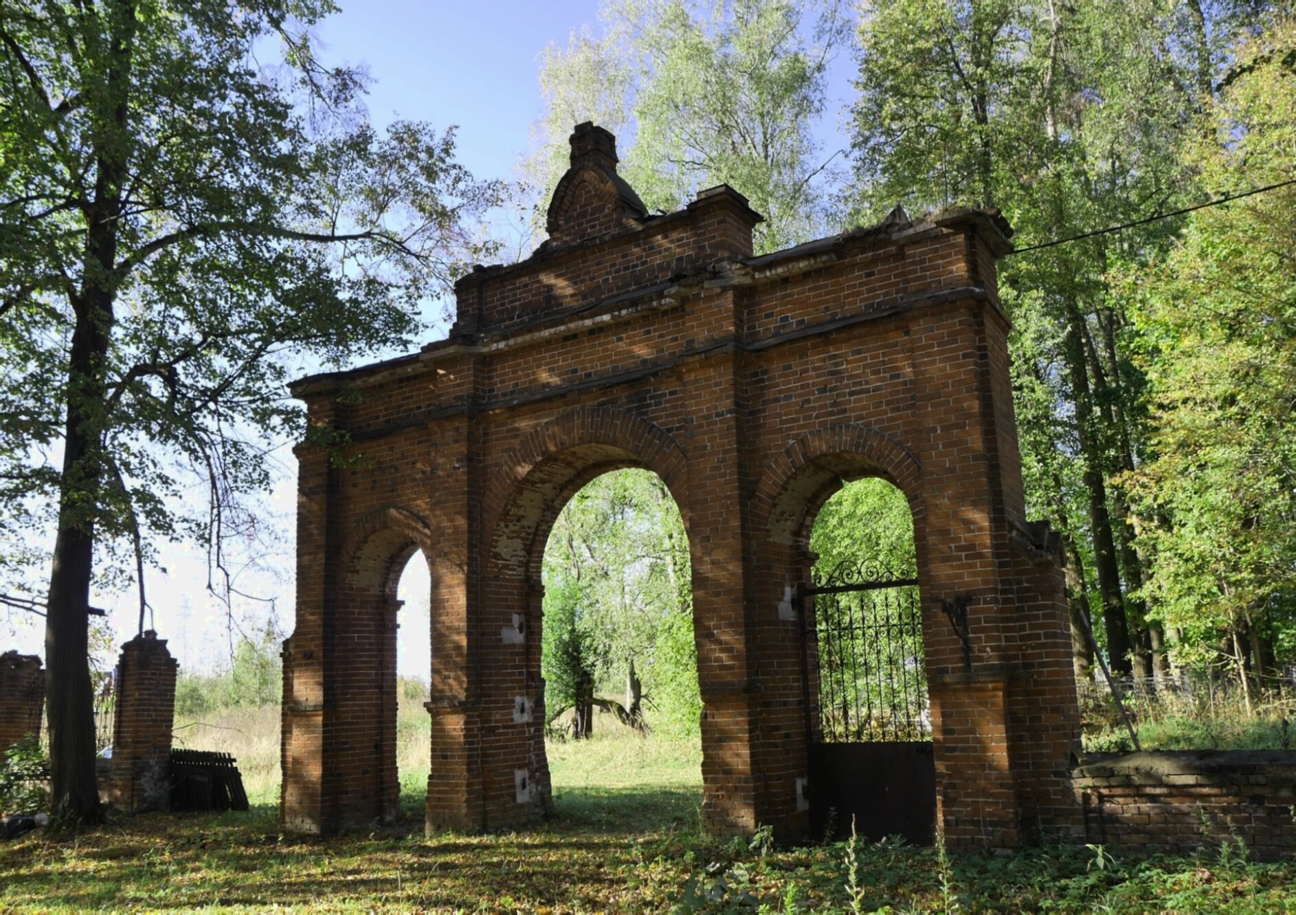 На представленной фотографии запечатлены исторические ворота Церкви Покрова Пресвятой Богородицы, расположенной в селе Мышенском Ступинского района Московской области. Данный памятник православной архитектуры, ныне пребывающий в запустении, представляет значительную культурно-историческую ценность.