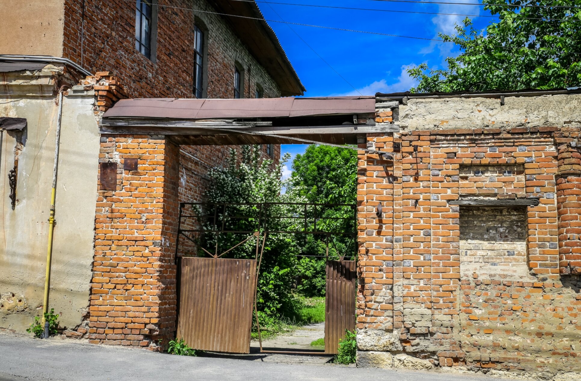 Архитектурный ансамбль дополняется видом на угол основного церковного здания из красного кирпича с двумя оконными проёмами, а также кирпичной стеной с остатками штукатурки. За воротами открывается вид на ухоженную территорию с густой зеленью деревьев и кустарников, где пролегает тропинка, ведущая вглубь церковного двора. Над всем архитектурным комплексом простирается голубое небо с белыми облаками, создающее атмосферу духовного покоя и умиротворения.
