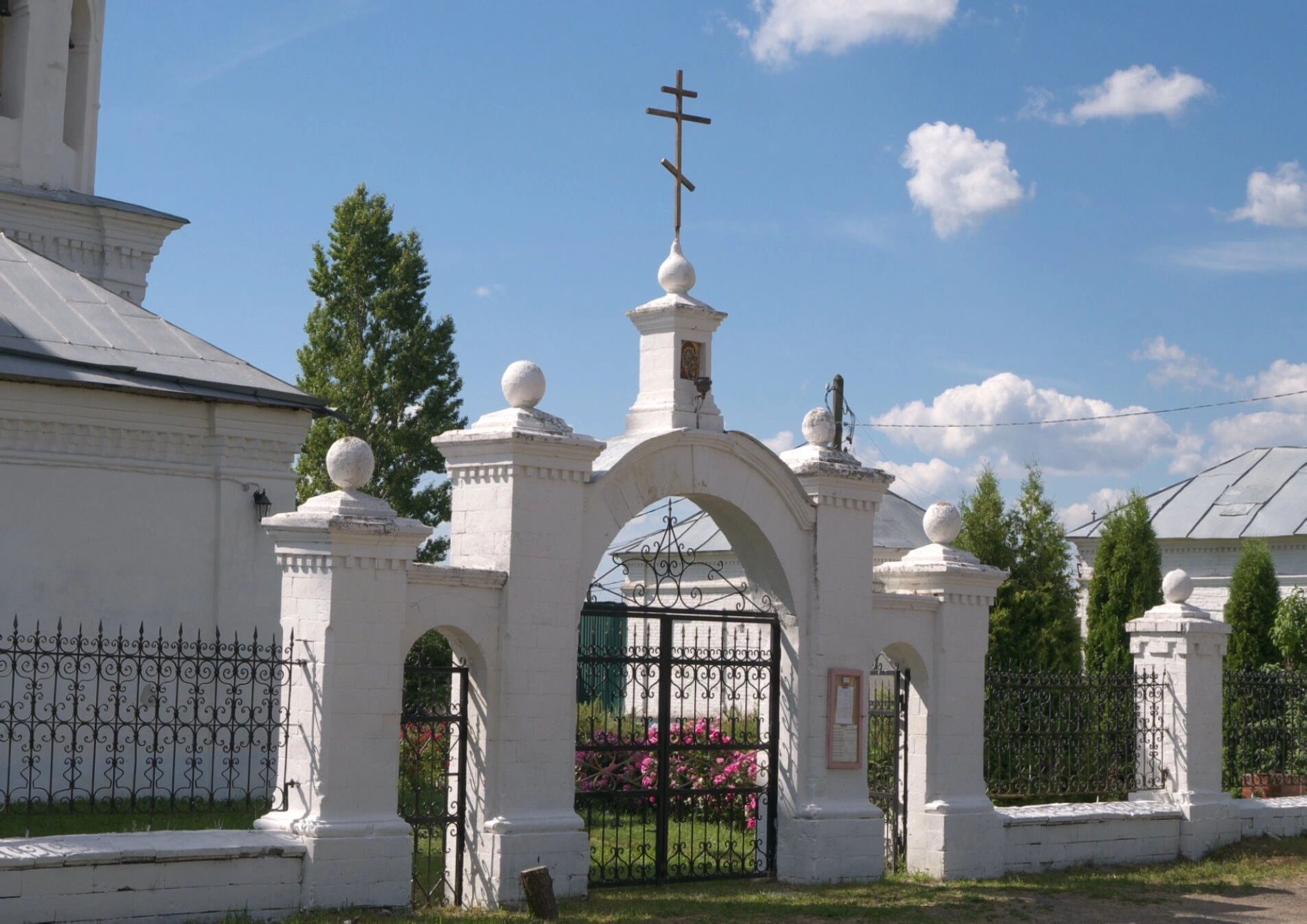 Фотография позволяет рассмотреть детали конструкции и художественного оформления церковных ворот, которые служат не только функциональным целям, но и являются неотъемлемой частью архитектурного ансамбля православной святыни. Снимок передает спокойное и величественное настроение, характерное для намоленных мест Подмосковья.