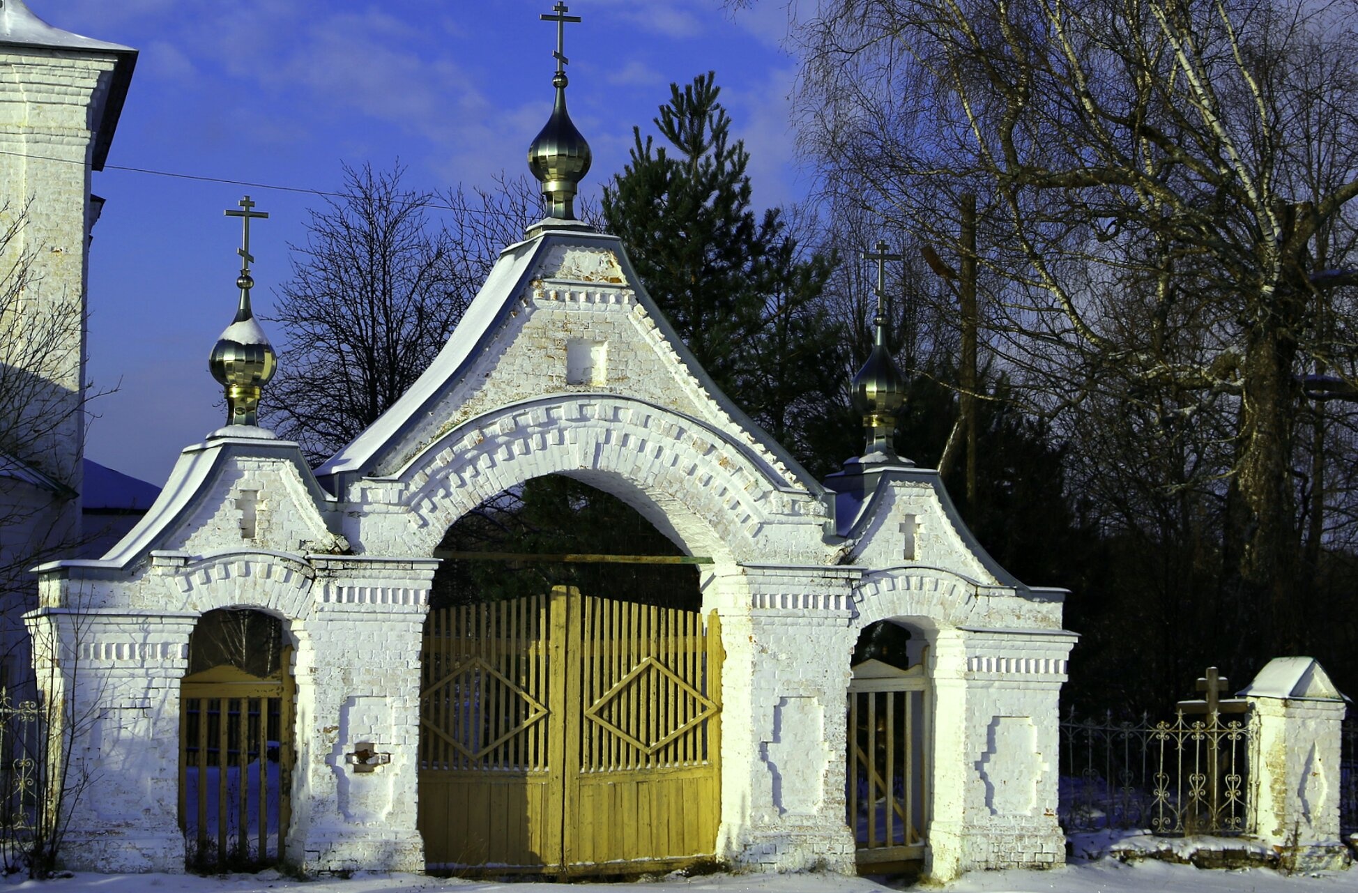 На снимке заметны следы времени на поверхности сооружения — местами облупившаяся штукатурка обнажает кирпичную кладку, что свидетельствует о необходимости реставрационных работ. Зимний пейзаж дополняет образ: снег покрывает карнизы и выступающие элементы ворот, а голые ветви деревьев на заднем плане контрастируют с вечнозелёной хвоей ели. Слева от ворот просматривается часть белоснежного церковного здания с характерными архитектурными элементами.