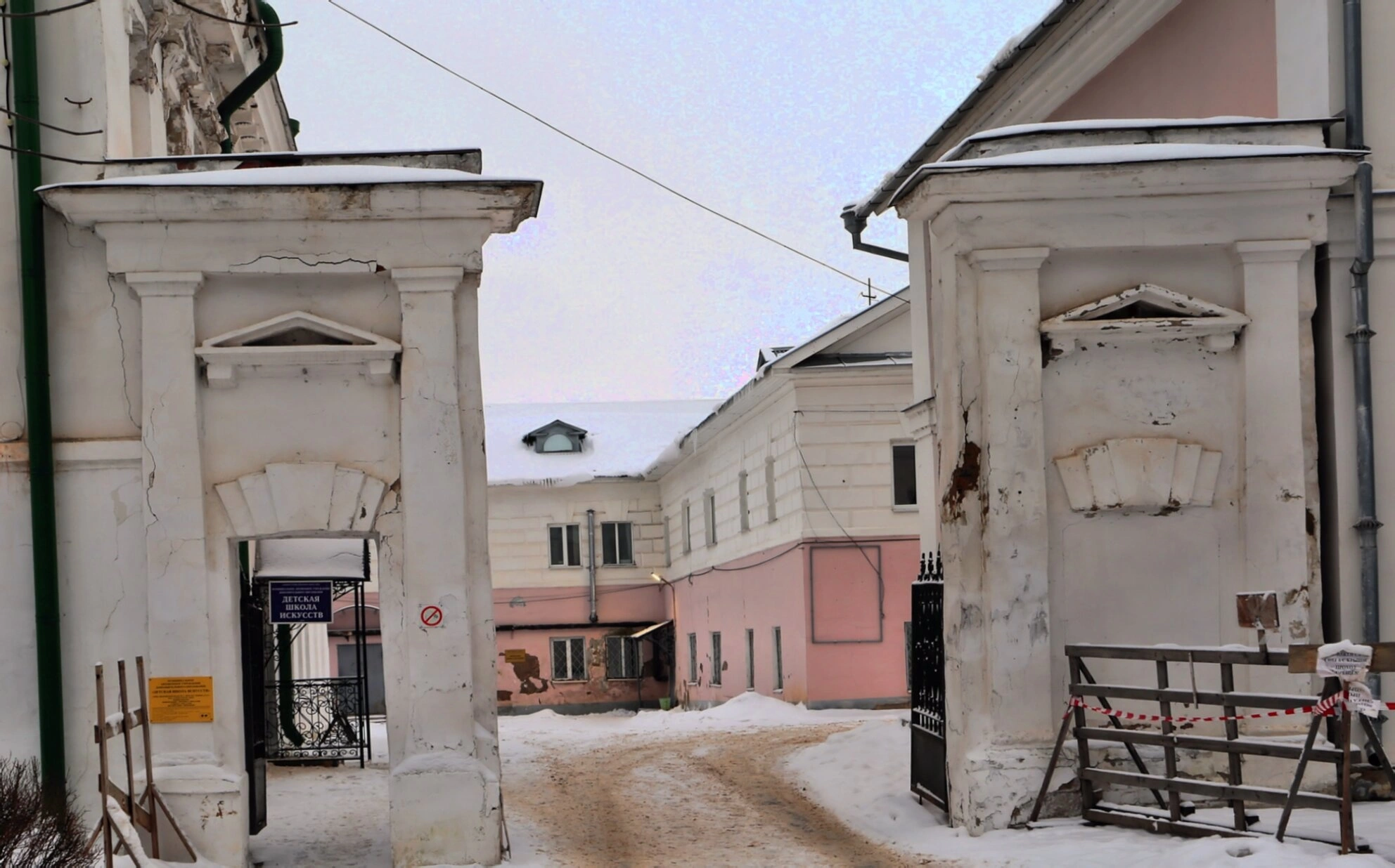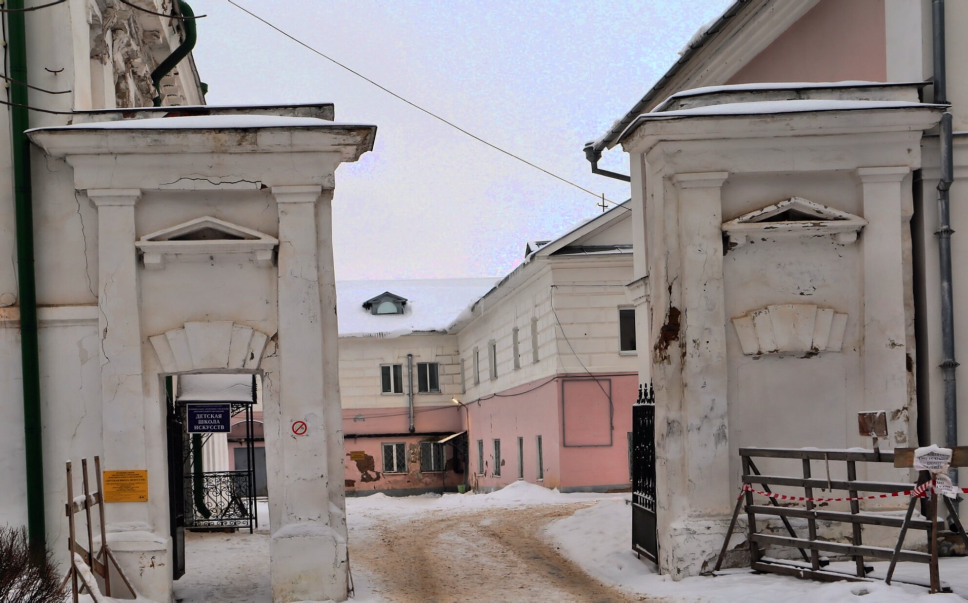 На представленной фотографии запечатлен входной проход во двор исторической усадьбы Посылиных в городе Шуя Ивановской области, где ныне располагается Шуйский историко-художественный музей. Святые врата, ведущие к Церкви во имя святых первоверховных апостолов Петра и Павла, изображены в благоговейном зимнем убранстве.
