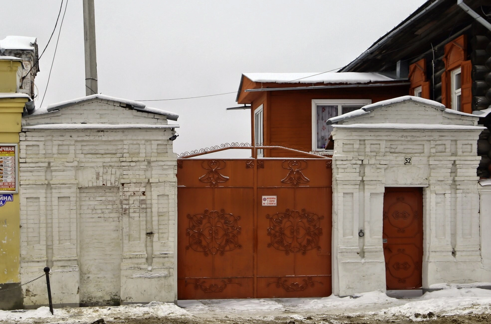 По обе стороны ворот возвышаются кирпичные столбы, облачённые в белоснежные одежды зимнего убранства. Архитектурное решение столбов отличается благородной сложностью форм с выступающими элементами, увенчанных двускатными завершениями. На правом столбе обращает на себя внимание малая красная дверь с обозначением номера 52, что соответствует историческому адресу усадебного комплекса.