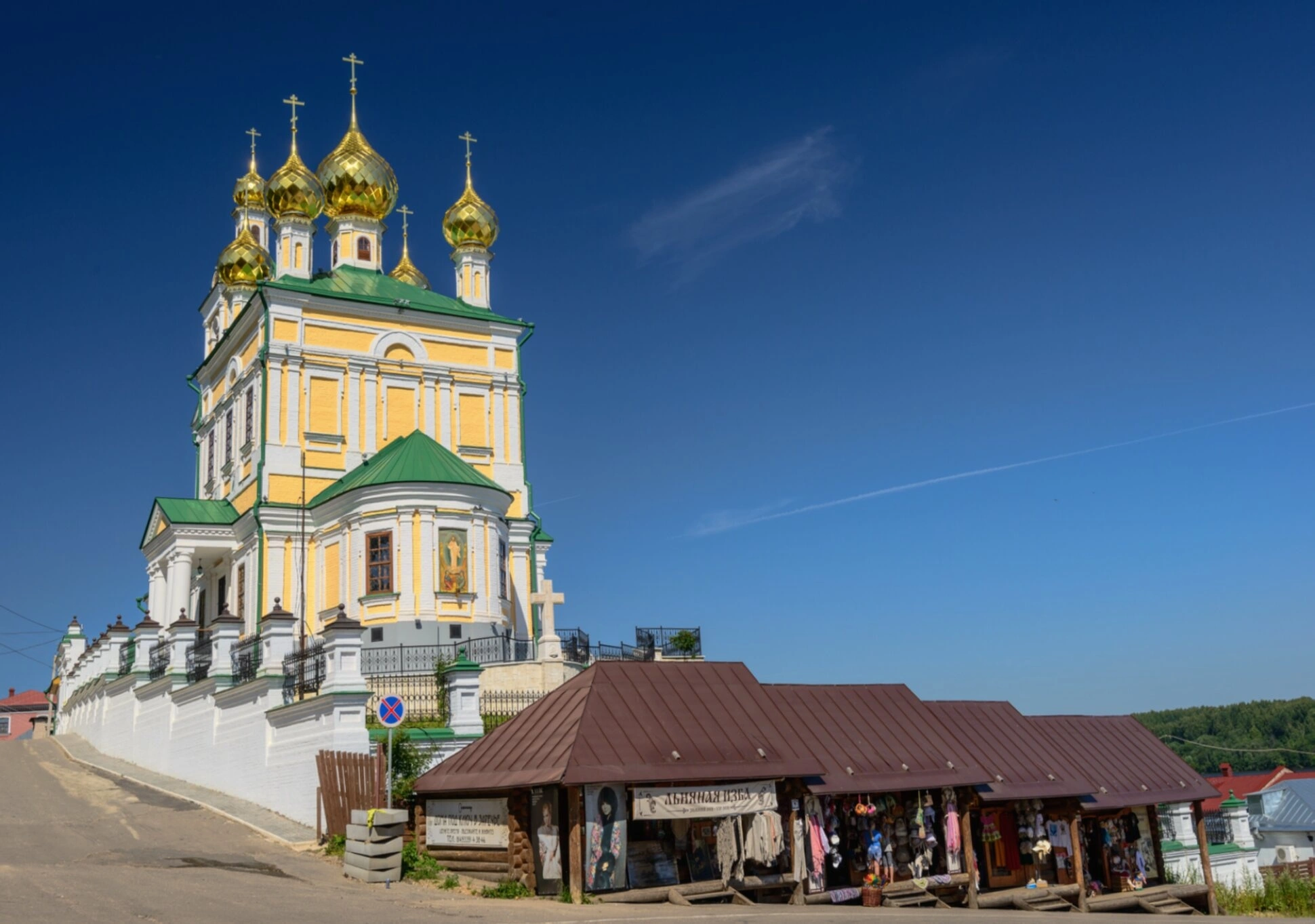 С возвышенности, где расположен храм, открывается благодатный вид на часть города и великую русскую реку Волгу, что делает это место особенно притягательным для паломников и путешественников. У подножия холма виднеются исторические Торговые ряды, подчёркивающие значение этой площади как центра городской жизни.