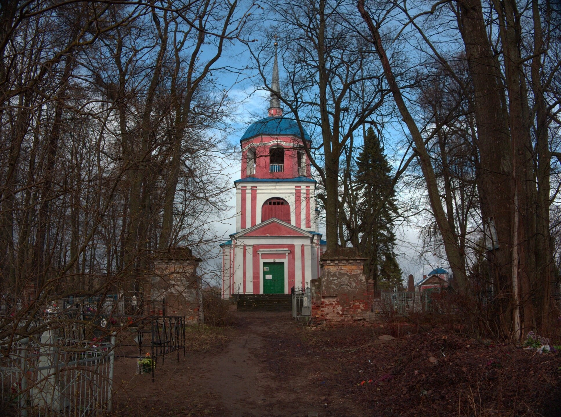 На переднем плане видна грунтовая дорога, ведущая ко входу на церковную территорию. Вход на погост, согласно историческим описаниям, довольно узкий, что соответствует традициям устройства церковных оград в этих местах. Территория храма включает в себя старинное кладбище с сохранившимися надгробиями и оградами, свидетельствующими о многовековой истории этого святого места.