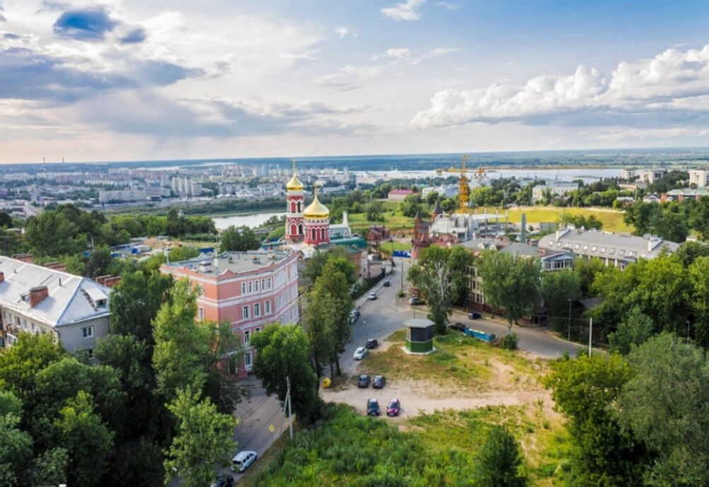 Церковь гармонично вписана в городской ландшафт, окружена исторической застройкой и зелёными насаждениями. На переднем плане фотографии виднеется прихрамовая территория, а в отдалении простирается водная гладь реки Оки, соединяющейся с Волгой. Панорама противоположного берега с городскими строениями создаёт величественный фон для храмового комплекса.