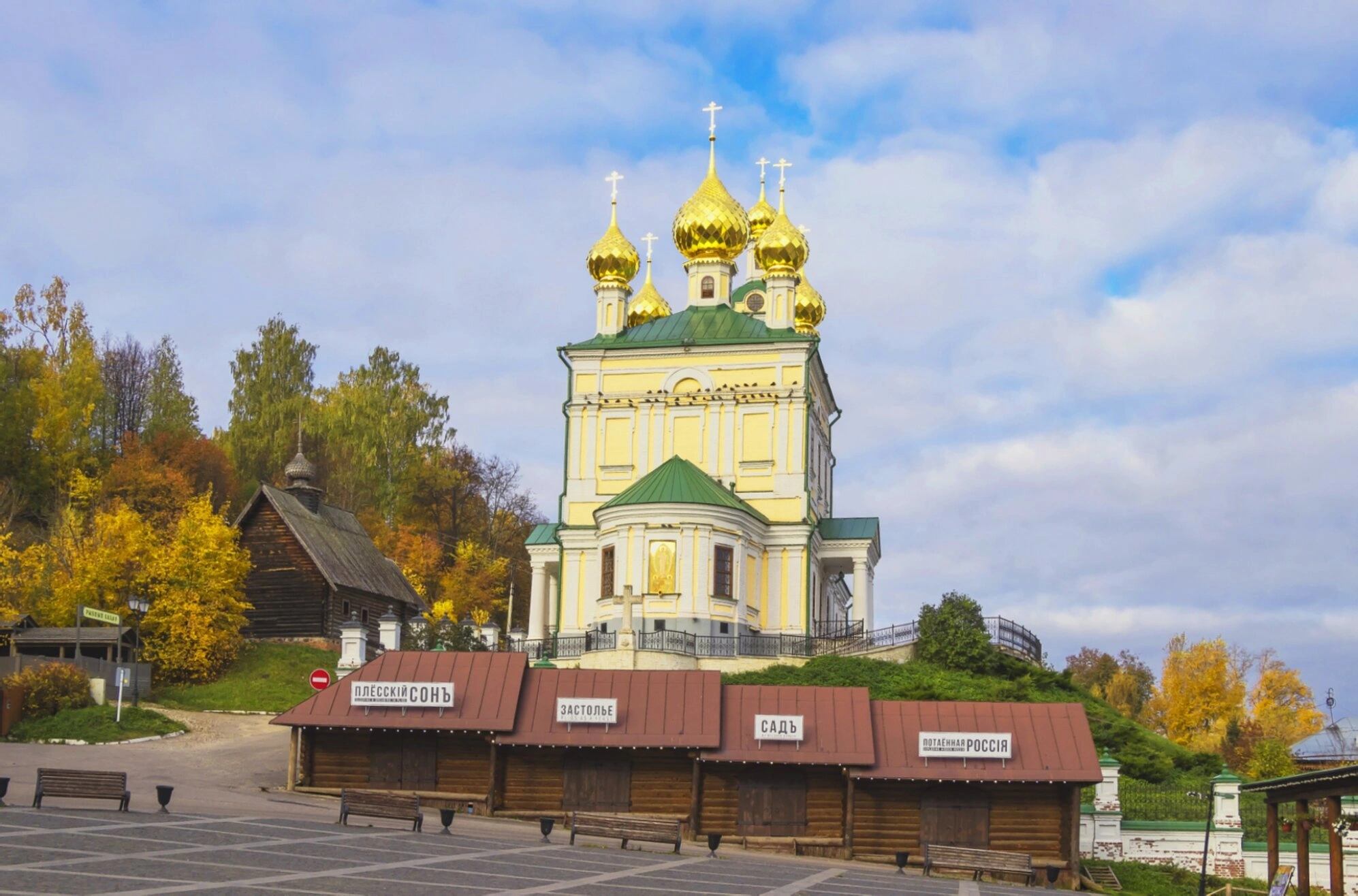 Перед святым храмом раскинулась мощёная площадь, на которой расположены несколько деревянных построек XIX века с тёсовыми кровлями. На их фасадах можно различить старинные вывески, такие как «ПЛЕССКІЙ СОНЪ» и «ЗАСТОЛЬЕ», что придаёт виду особый дух старины и уюта. Вся композиция снята с возвышенности, открывая взору панораму, окружённую деревьями в золотисто-багряном осеннем уборе.