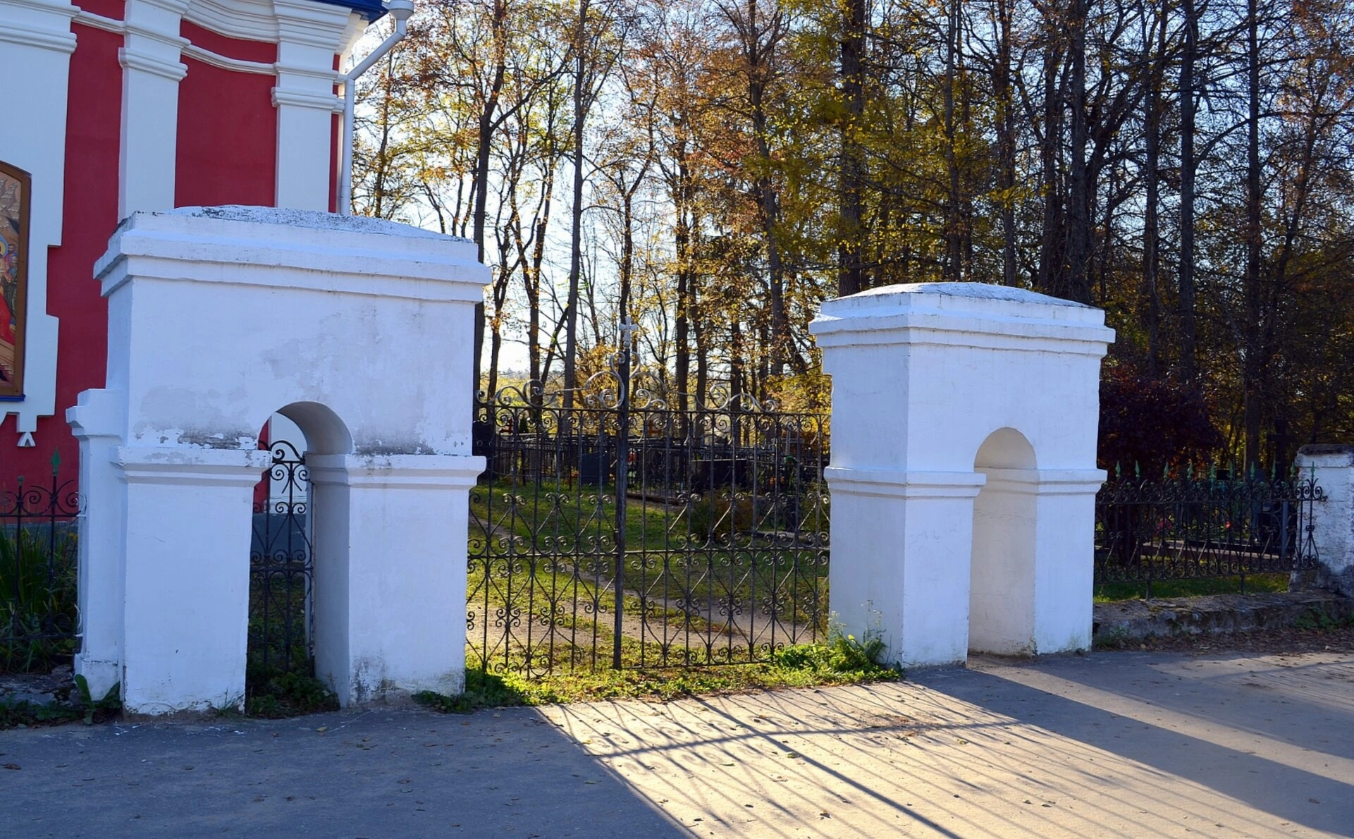 Две белоснежные каменные арки-пилоны, увенчанные православными крестами, образуют торжественный вход на церковную территорию. Между ними расположены ажурные кованые створки ворот, демонстрирующие высокое мастерство кузнечного искусства. Сквозь проём ворот открывается вид на саму Воскресенскую церковь с характерной красно-белой полосатой окраской фасада.