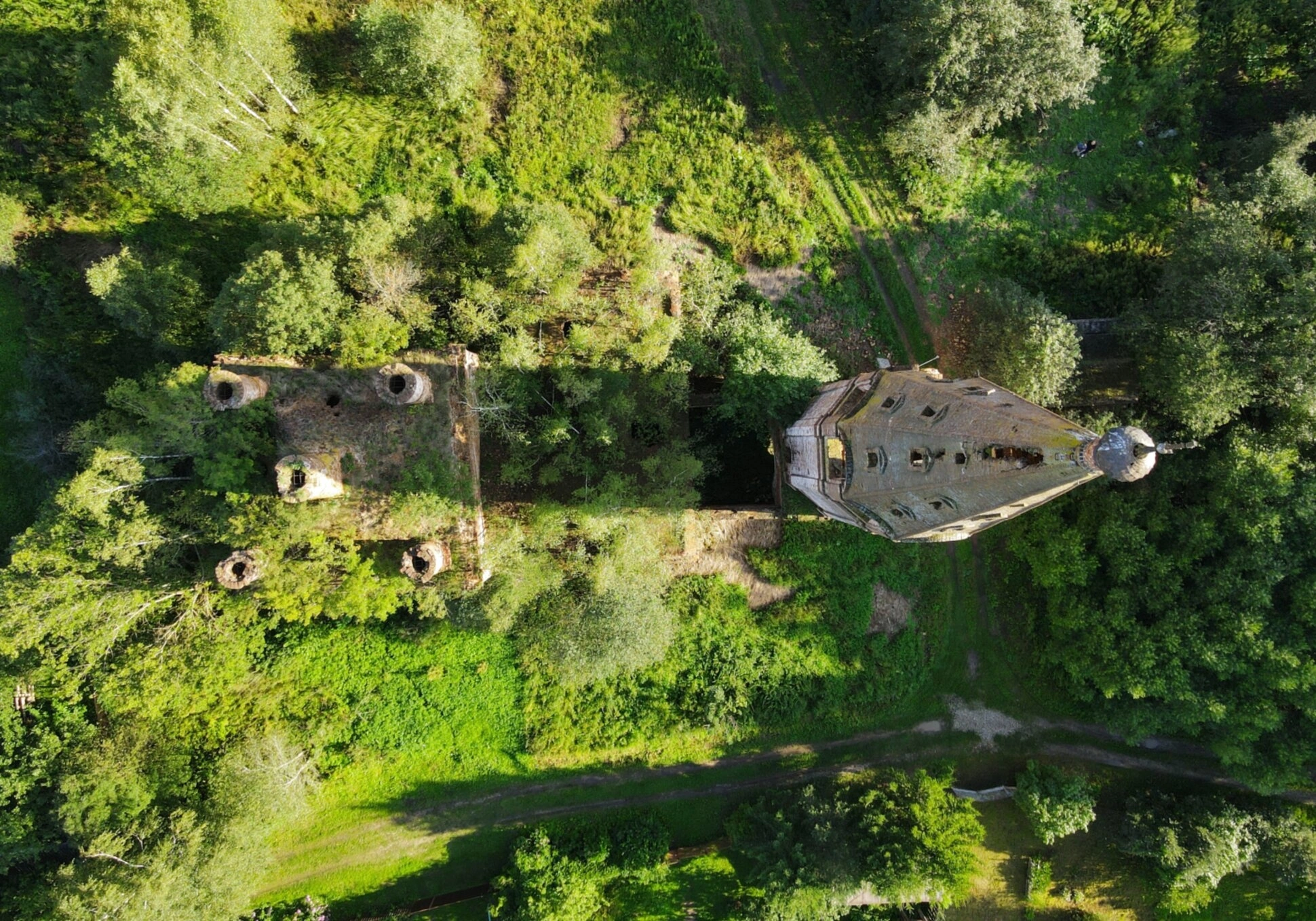 Аэрофотосъемка предоставляет уникальную возможность рассмотреть планировочную структуру храмового комплекса и его расположение в ландшафте. Отсутствие реставрационных работ и консервации памятника архитектуры вызывает обеспокоенность за его дальнейшую сохранность. Данный снимок служит важным документом, фиксирующим современное состояние объекта культурного наследия.