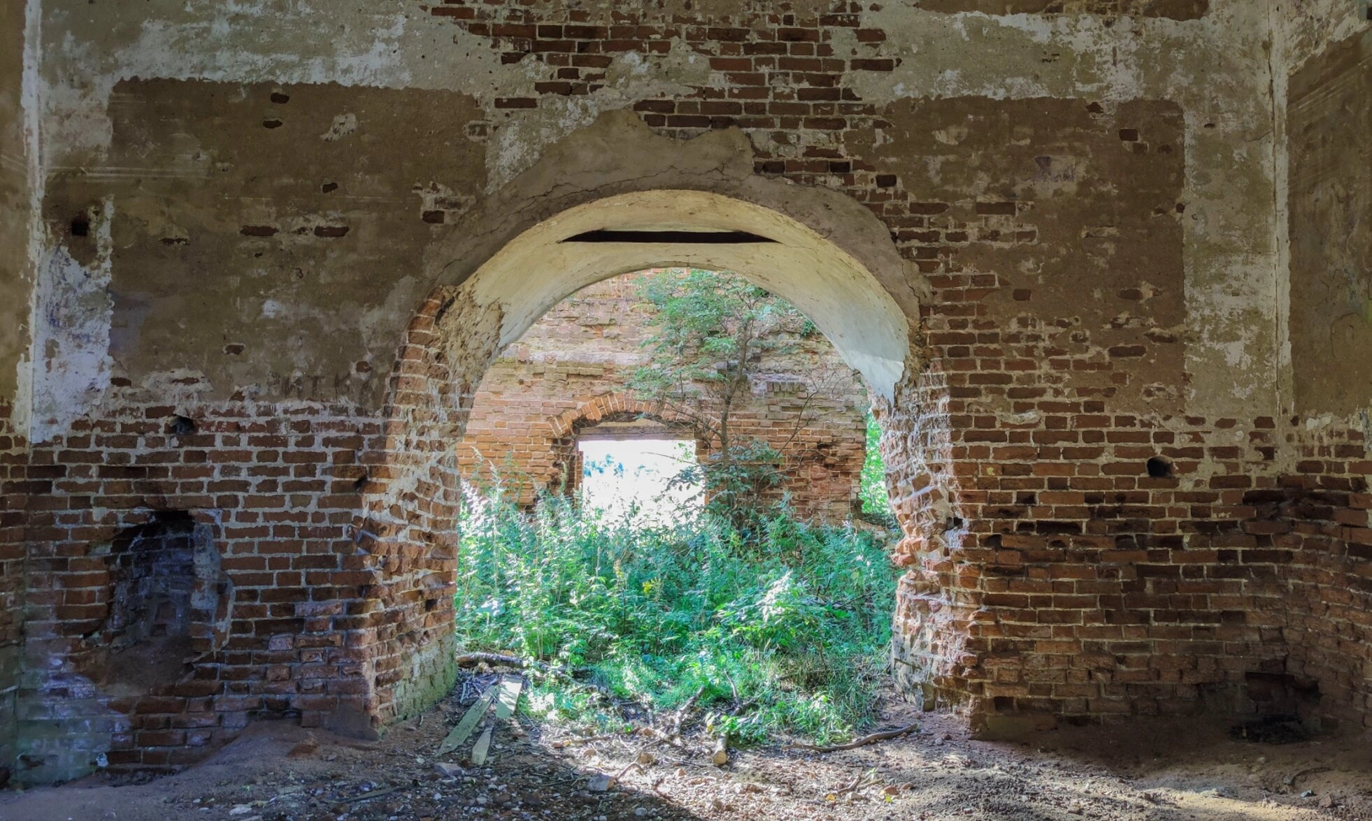 На представленной фотографии запечатлены скорбные руины Воскресенской церкви, расположенной в селе Афанасьево Ивановской области. Храм находится в плачевном состоянии: кирпичные стены частично обрушены, штукатурка осыпалась, а некогда величественные арки стоят без перекрытий. Сквозь центральную арочную конструкцию, которая в прошлом служила связующим звеном между различными частями церковного здания, просматривается заросший травой и кустарником церковный двор.