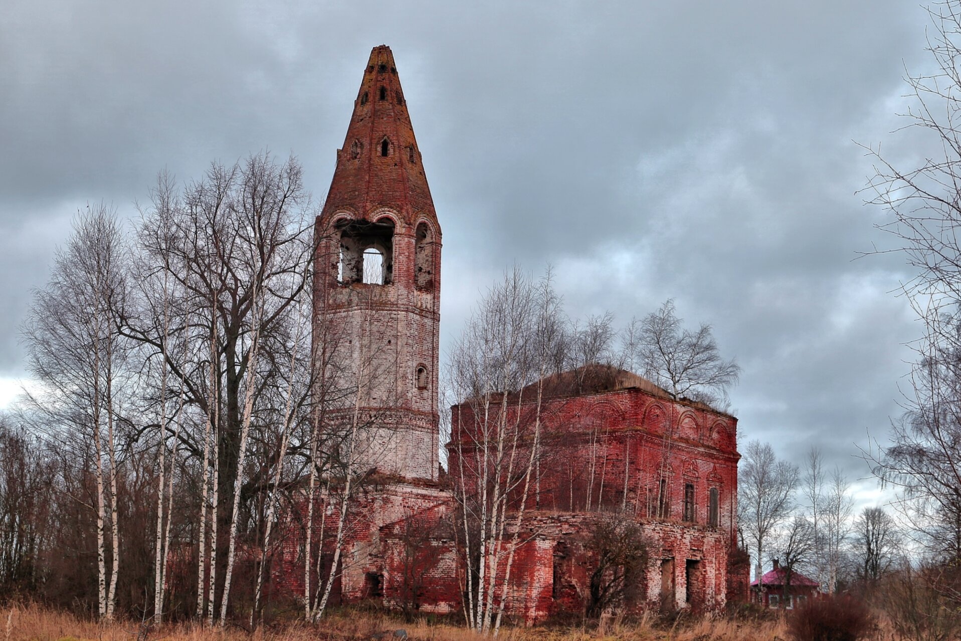 Окружающий пейзаж дополняет печальную картину: храм стоит среди обнажённых берёз, что свидетельствует о съёмке в осенне-зимний период. Деревья, словно верные стражи, окружают полуразрушенную святыню, создавая атмосферу тихой грусти и утраты. Отсутствие реставрационных работ и консервации памятника архитектуры позволяет природе постепенно возвращать своё над творением человеческих рук.