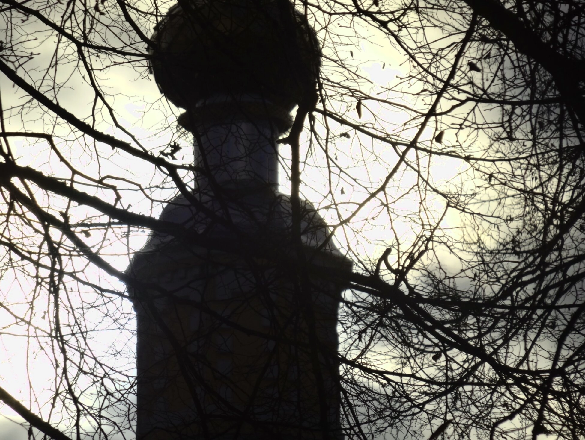 На фотографии запечатлён величественный силуэт Воскресенской церкви, расположенной в старинном селе Ермолино Ивановской области. Архитектурной доминантой снимка является шатровая колокольня и тёмный купол, эффектно выделяющиеся на фоне светлого неба. Монументальность храмового строения подчёркивается ажурным переплетением безлистных ветвей деревьев, которые, обрамляя кадр, создают ощущение глубины и таинственности.