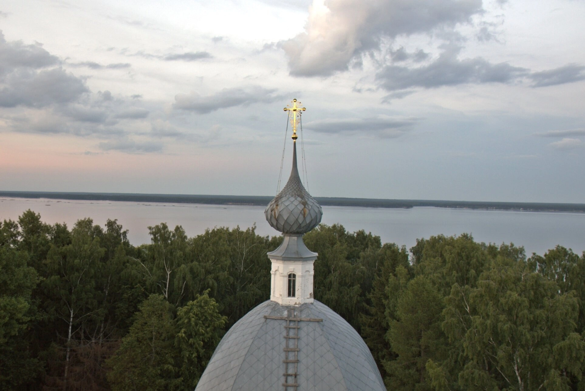 На фотографии запечатлена Воскресенская церковь в селе Нежитино Макарьевского района Костромской области. Святыня величественно возвышается над окружающим пейзажем, демонстрируя свой устремлённый в небо восьмерик, увенчанный восьмилотковой кровлей и изящной главкой на световом барабане. Позолоченный крест, венчающий храмовую главку, символизирует победу жизни над смертью и напоминает о спасительном подвиге Господа нашего Иисуса Христа.