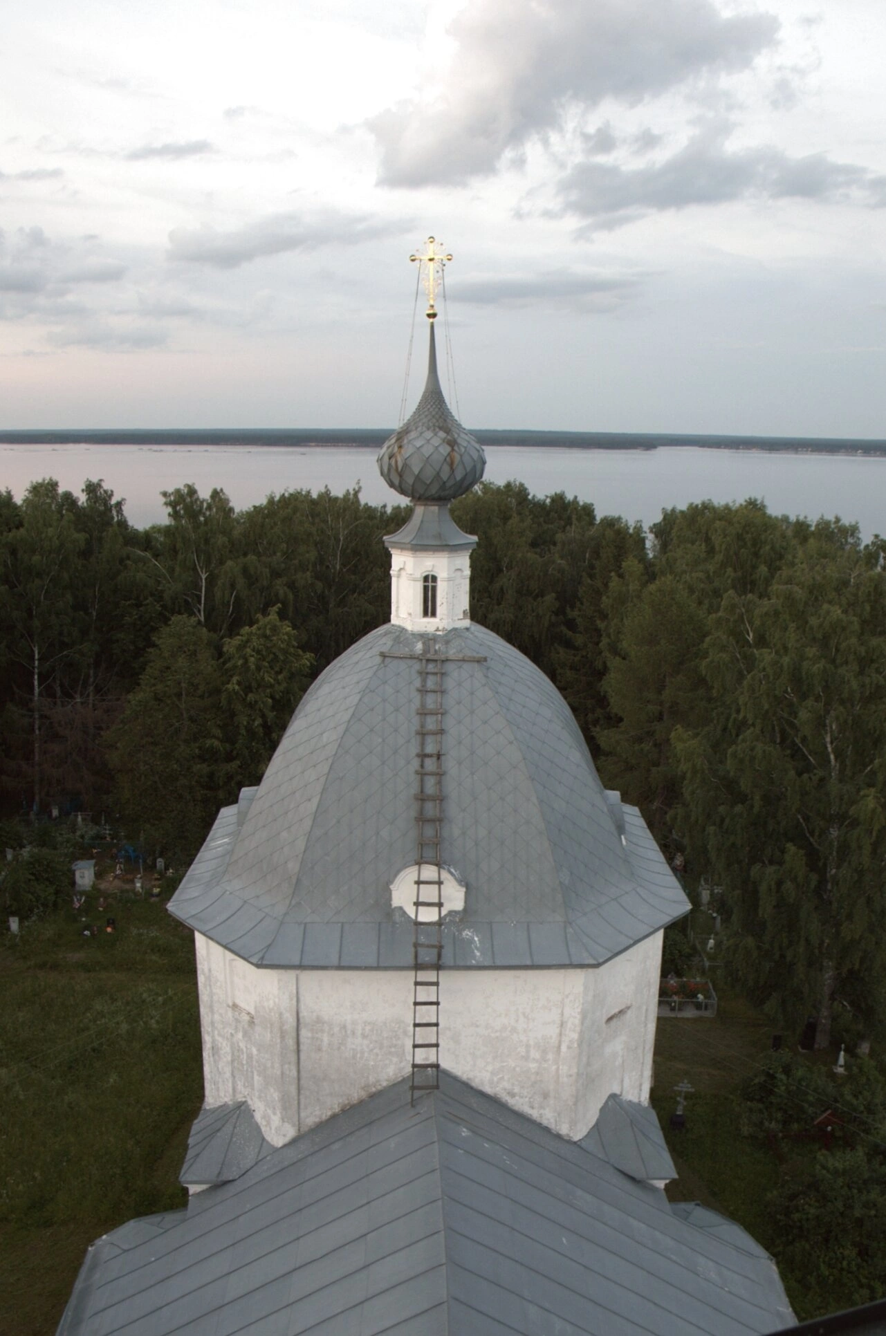 К барабану приставлена лестница, ведущая к оконному проему, что свидетельствует о проведении реставрационных или хозяйственных работ на момент съемки. Серая кровля основного объема храма служит надежным основанием для этого архитектурного завершения. На заднем плане открывается вид на водоем и лесной массив, подчеркивая гармоничное единство творения рук человеческих и божьего мира. Часть церковного кладбища, видимая в кадре, напоминает о вечности и христианской надежде на воскресение, что соответствует посвящению храма.