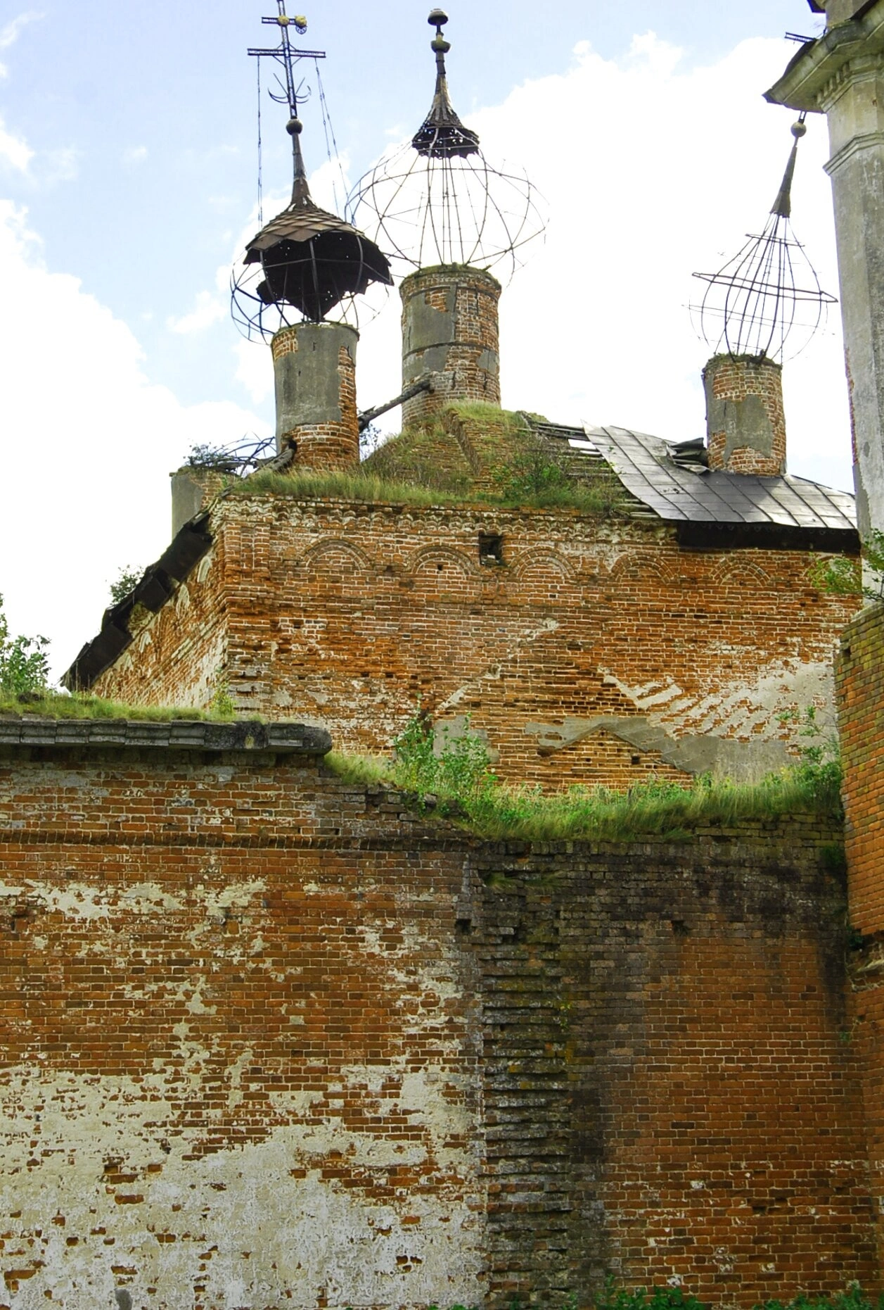 Кирпичные стены храма несут следы давнего запустения: фрагментарно обвалившаяся штукатурка, обнажённая кладка, наслоения мха и побелки. Территория вокруг церковных стен обильно заросла травой и дикой растительностью, что подчёркивает забытый статус этого некогда духовного центра. На заднем плане фотографии просматриваются очертания ещё одной постройки, возможно, колокольни или вспомогательного строения, также пребывающего в ветхом состоянии.