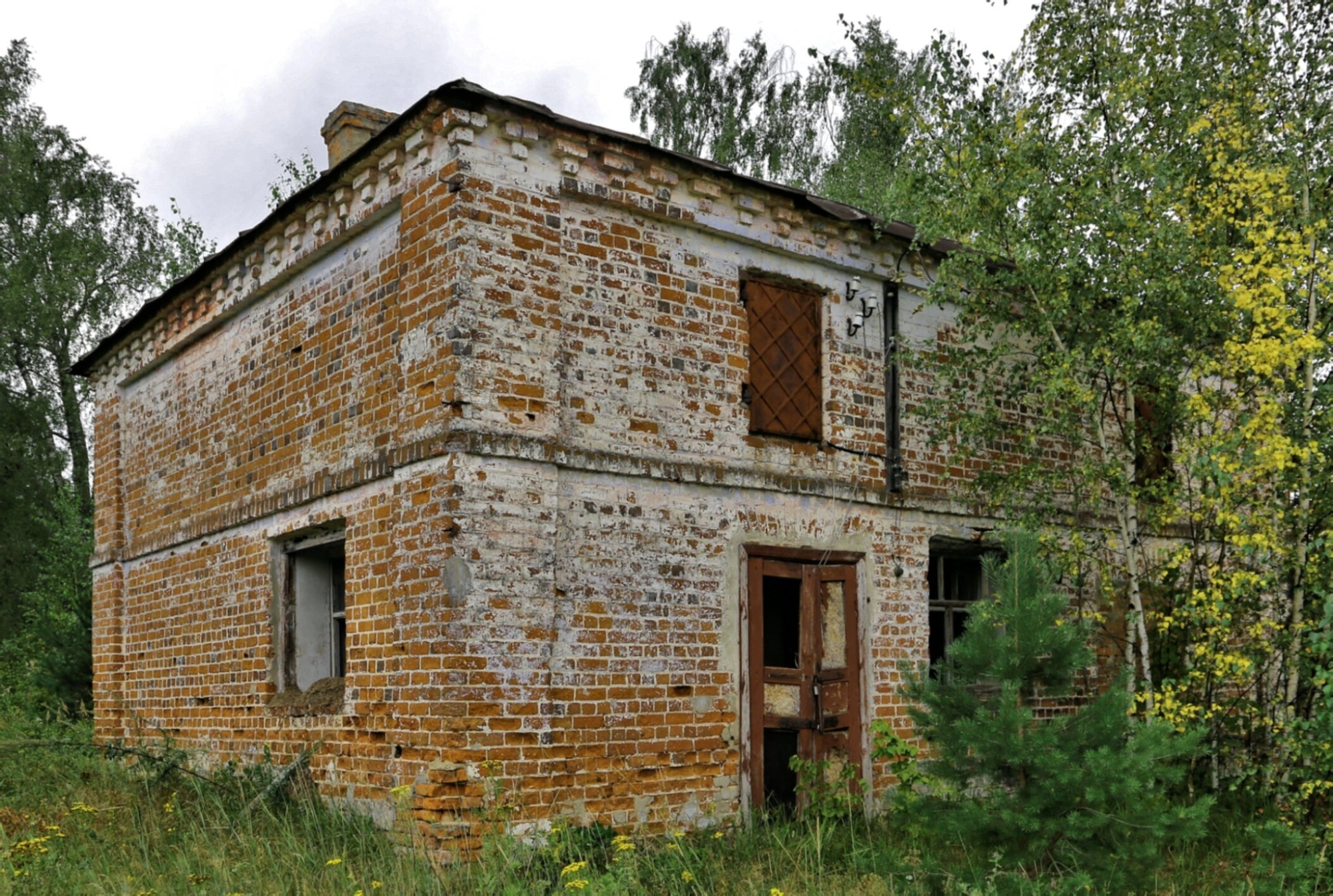 Здание церкви выполнено из красного кирпича, характерного для храмовой архитектуры конца XIX - начала XX веков. Со временем кирпичная кладка подверглась естественному разрушению: наблюдается выцветание поверхности, частичное осыпание, обнажающее более светлые слои материала. На стенах сохранились фрагменты старой побелки или штукатурки, что позволяет судить о первоначальном облике сооружения.