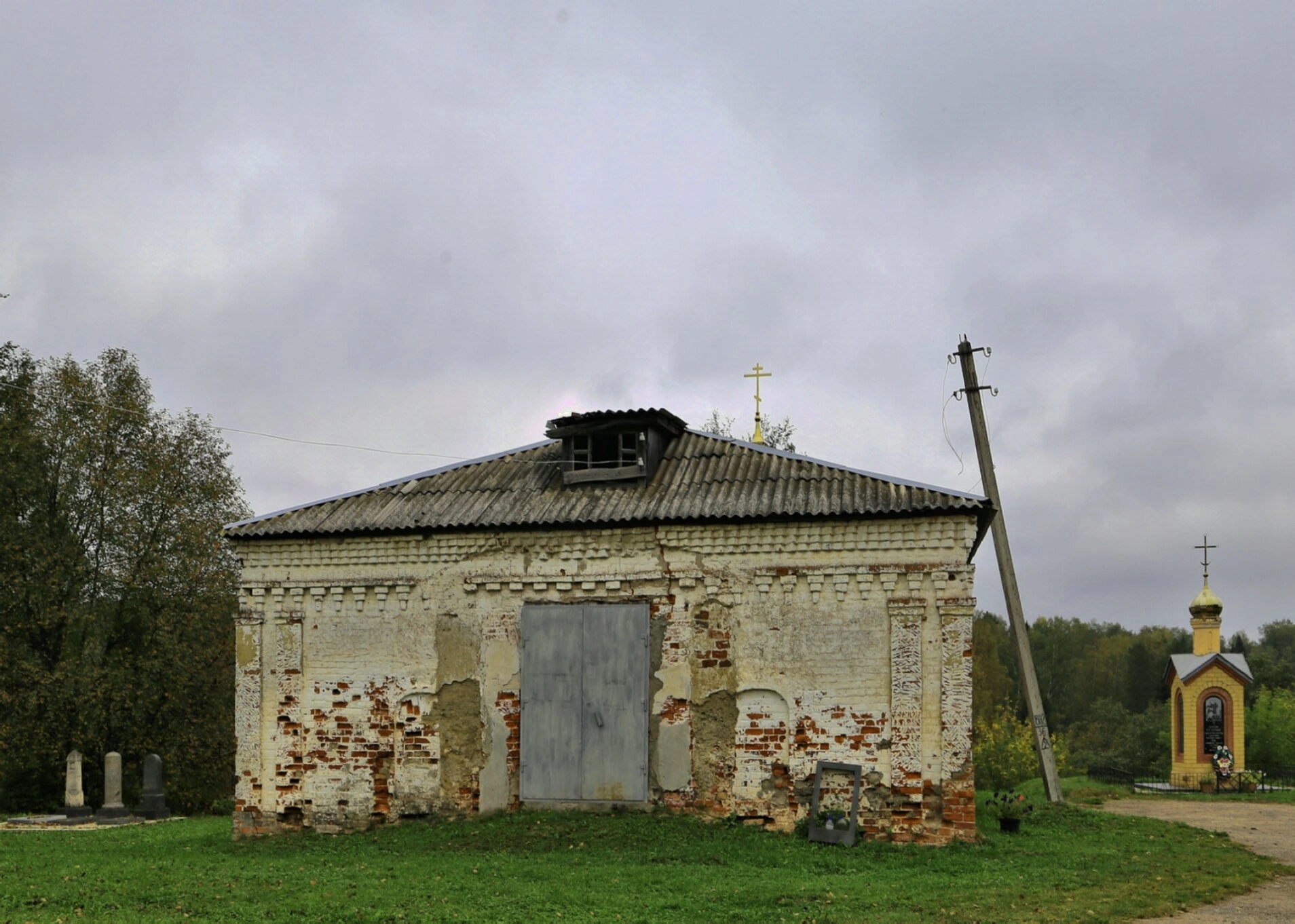 Справа от основного здания располагается часовня, увенчанная золоченым куполом с крестом, характерным для русской православной архитектуры. Присутствие надгробий слева от храма указывает на расположение церковного комплекса на территории погоста. Наклоненный деревянный столб с электропроводами подчеркивает заброшенность места.