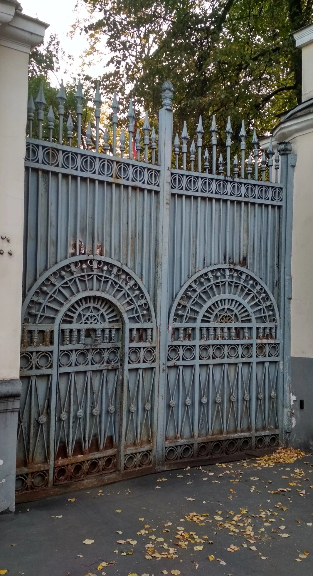 На представленной фотографии запечатлены величественные въездные ворота и ограда, принадлежащие к комплексу Воскресенской часовни, расположенной в историческом районе Москвы - Мещанской слободе. Массивные металлические ворота, выполненные в традициях православного церковного зодчества, поражают своим благолепием и духовной значимостью.