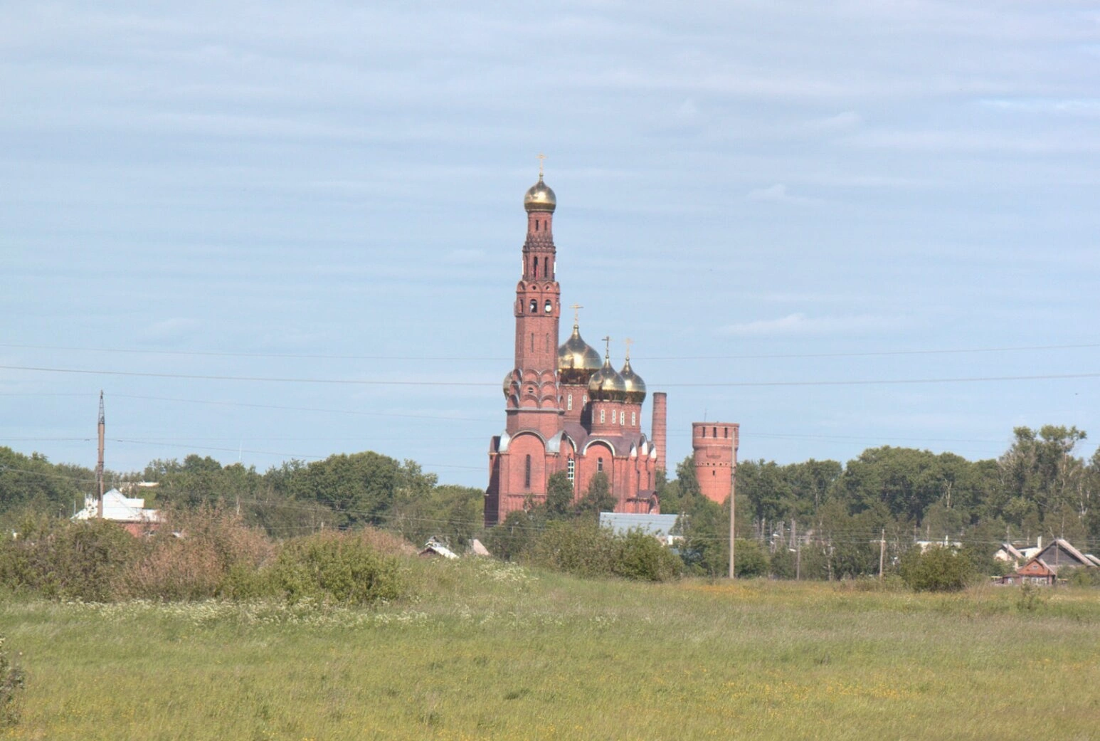 На представленной фотографии запечатлён величественный Воскресенский храм, известный также как Красная церковь, расположенный в городе Вичуга Ивановской области. Храм возвышается среди зелени деревьев и раскинувшихся вокруг полей, что придаёт ему особый, благолепный вид на фоне небесной лазури с лёгкими облаками.