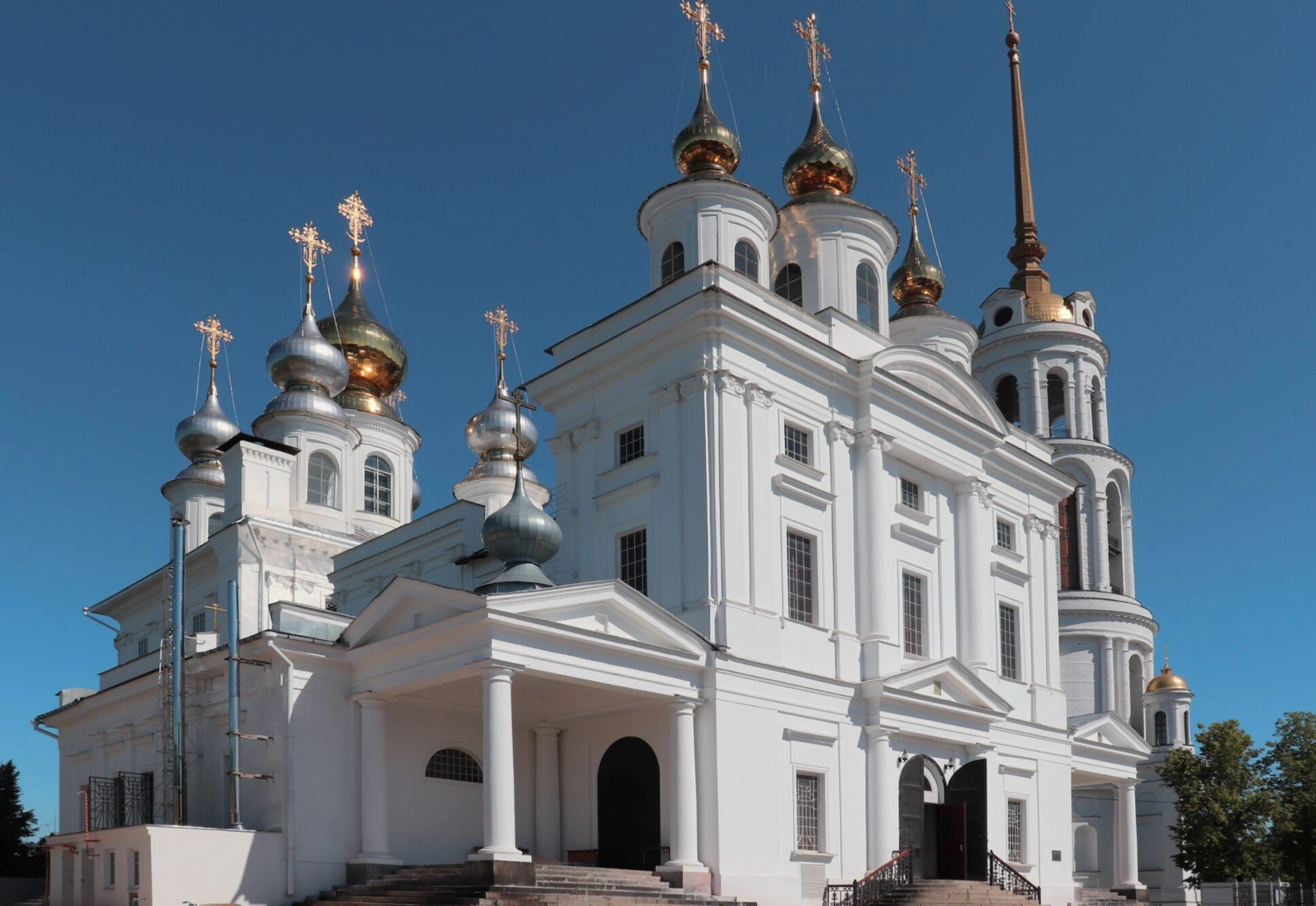Белоснежный пятиглавый собор, увенчанный златоглавыми куполами с вознесёнными к небу крестами, представляет собой прекрасный образец русского классицизма. Его строгие и благородные формы, украшенные колоннами и пилястрами, создают ощущение неземной гармонии и величия. Особое внимание на снимке приковывает монументальная четырёхъярусная колокольня, которая достигает высоты 106 метров и по праву считается одной из самых высоких в России среди отдельно стоящих звонниц.