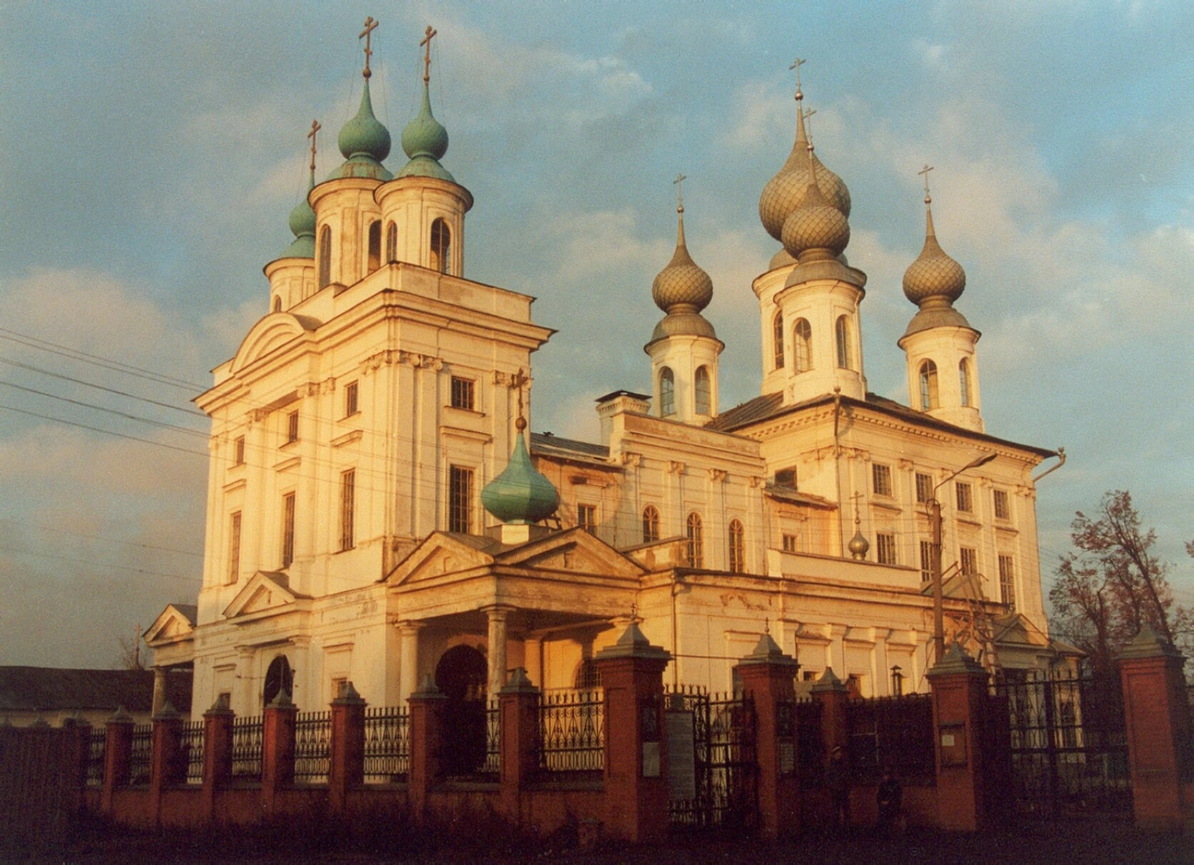 Собор, возведённый в 1810 году, выполнен в стиле позднего классицизма и поражает своими монументальными формами и гармоничными пропорциями. На снимке прекрасно видна его светлая кладка, которая в лучах закатного солнца приобретает особый, тёплый оттенок. Архитектурный ансамбль включает в себя основное здание храма и знаменитую колокольню, которая на момент постройки была первой в России по высоте среди звонниц, отдельно стоящих от храмовых зданий.
