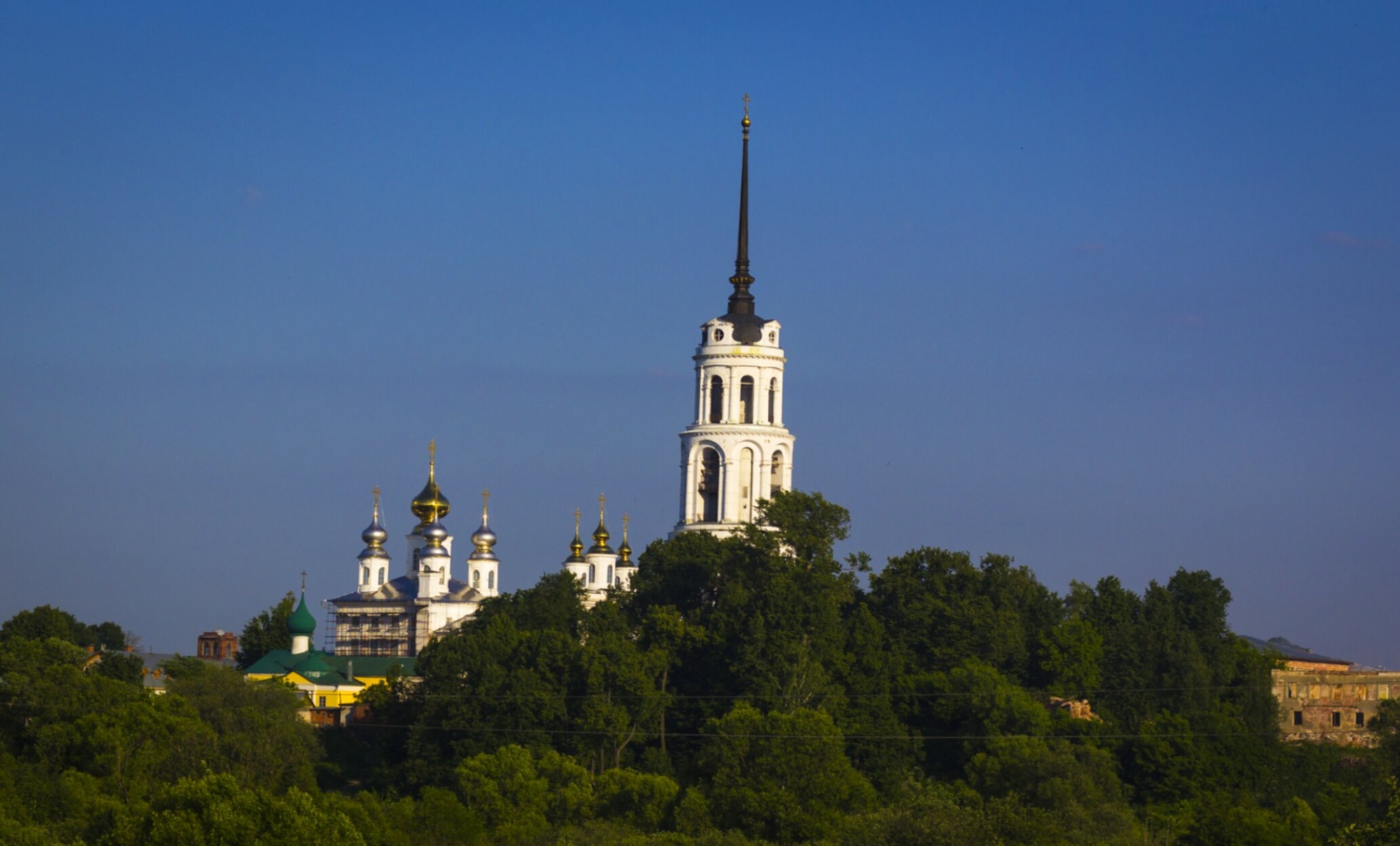 На фотографии запечатлён величественный ансамбль Воскресенского кафедрального собора, что возвышается в историческом центре города Шуи Ивановской области. В центре композиции горделиво парит к небесам знаменитая колокольня собора, которая является самой высокой не только в городе, но и во всём регионе, достигая высоты 106 метров. Этот духовный символ Шуи виден из самых отдалённых точек города и его окрестностей.