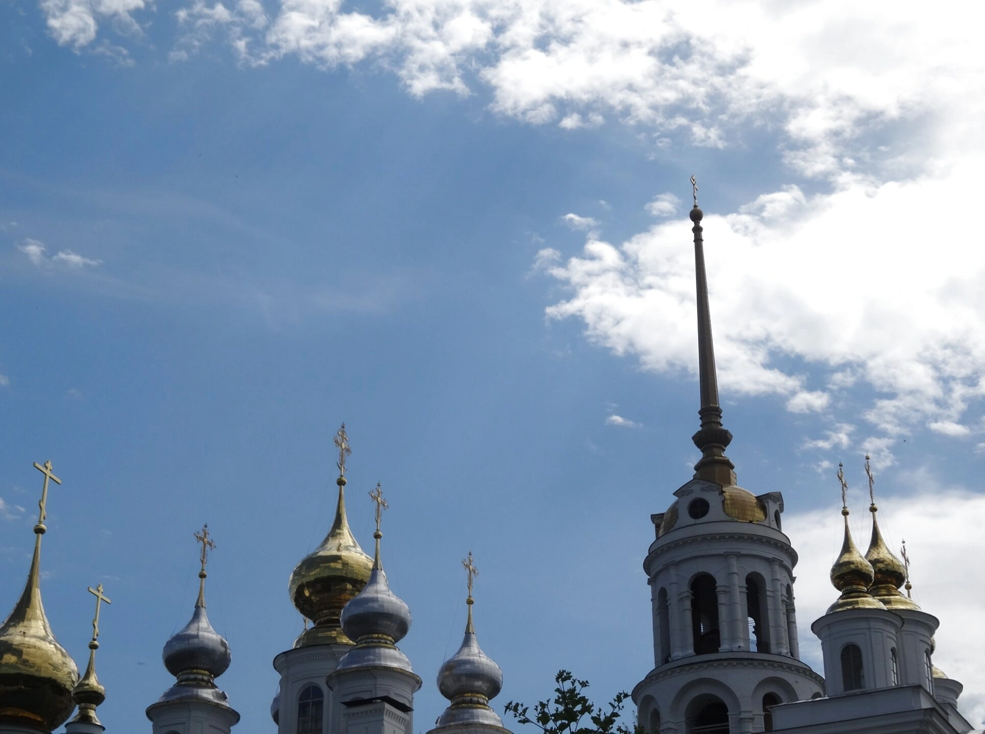 На снимке также видны золочёные и окрашенные в лазоревый цвет главы самого собора, увенчанные православными крестами. Благородное сочетание золота, синего и белого цветов создаёт праздничное и торжественное настроение. Белоснежные стены храма, освещённые солнечным светом, подчёркивают чистоту и величие православной веры.