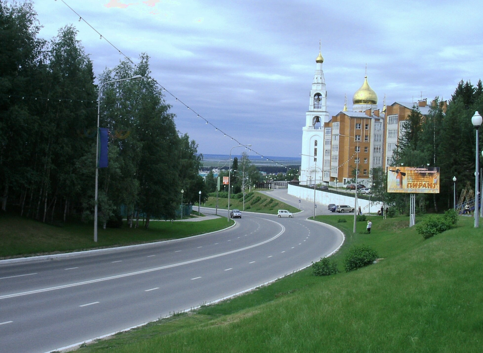 На фотографии запечатлён прекрасный вид, открывающийся на подъезде к одному из духовных центров Западной Сибири — Воскресенскому кафедральному собору в Ханты-Мансийске. Снимок сделан с асфальтированной дороги, которая извилистой лентой ведёт путника прямо к святым вратам храмового комплекса, символизируя путь православного человека к Богу.