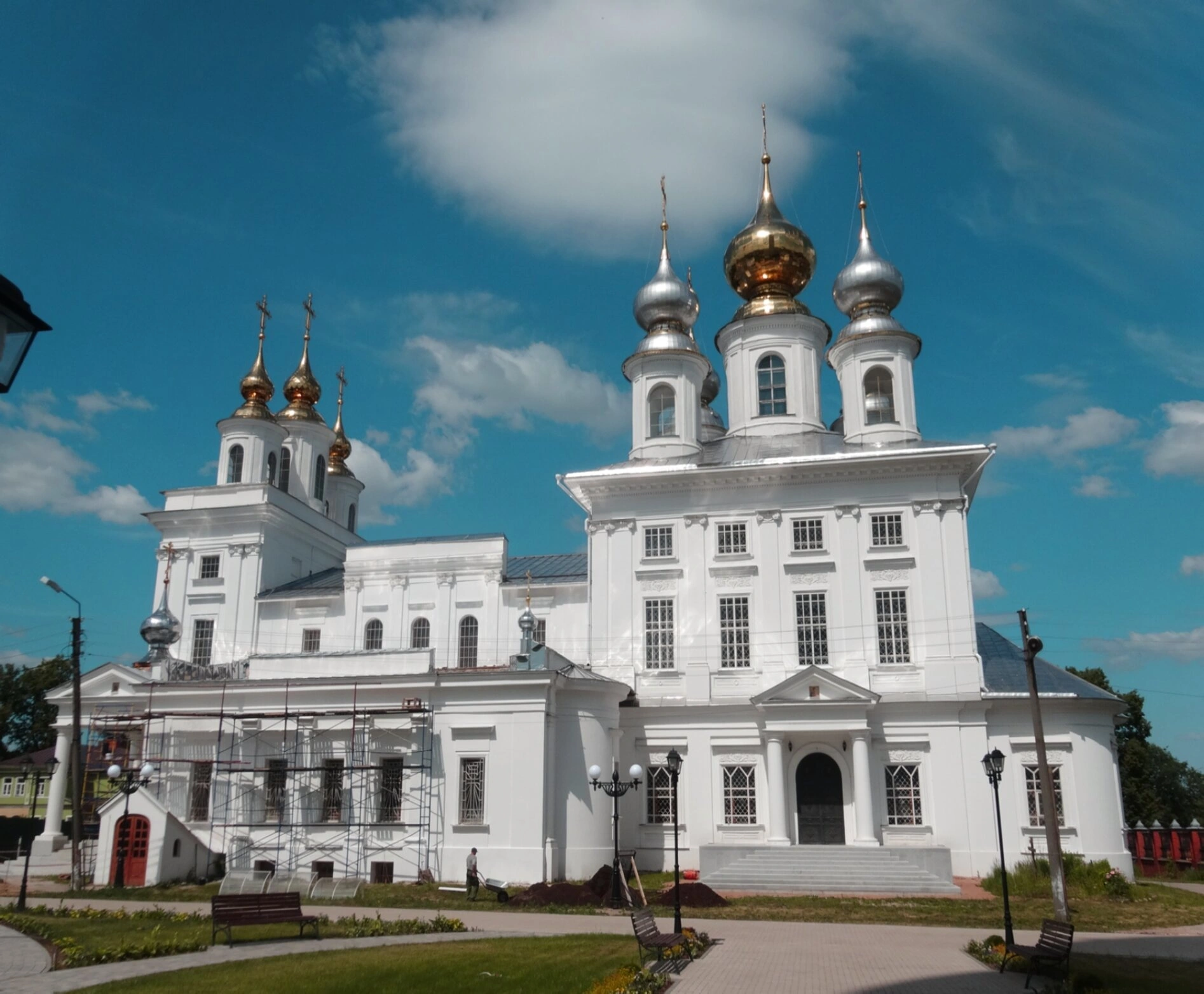 Архитектурный ансамбль собора гармонично сочетает строгость классических форм и духовное величие православного зодчества. На фотографии хорошо просматривается монументальный объём самого храма и устремлённая в небо многоярусная колокольня, увенчанная золочёной главкой с крестом. Белоснежные стены и изящный декор фасадов создают образ неземной красоты и благодати.