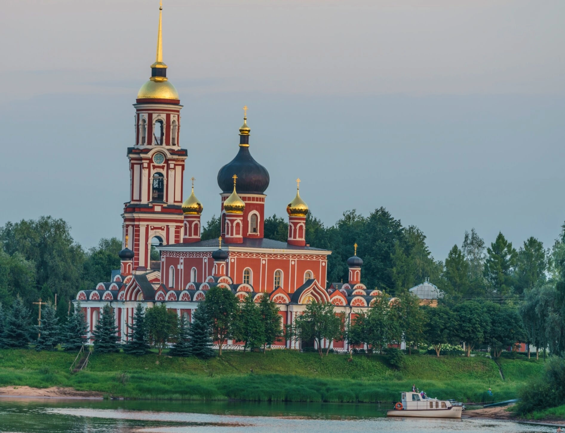На представленной фотографии запечатлён величественный Воскресенский кафедральный собор, являющийся одной из главных духовных и архитектурных доминант древнего города Старая Русса. Белоснежный храм с зелёными кровлями и сияющими на солнце золотыми куполами живописно расположен на стрелке при слиянии рек Полисть и Перерытица, что создаёт особый, узнаваемый образ.