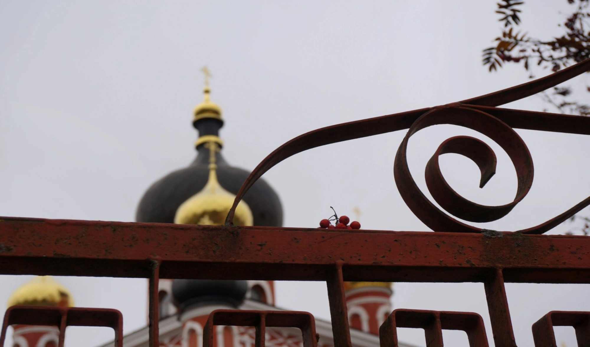 На снимке хорошо просматривается нарядный фасад собора, выполненный из красного кирпича и богато украшенный белыми декоративными элементами. Белоснежные пилястры, наличники арочных окон и закомары создают выразительный контраст с тёплым цветом стен. Особое внимание привлекает композиция из пяти глав, увенчанных православными крестами. Центральная золочёная глава символизирует Господа Иисуса Христа, а четыре окружающие её тёмные главки – четырёх евангелистов.