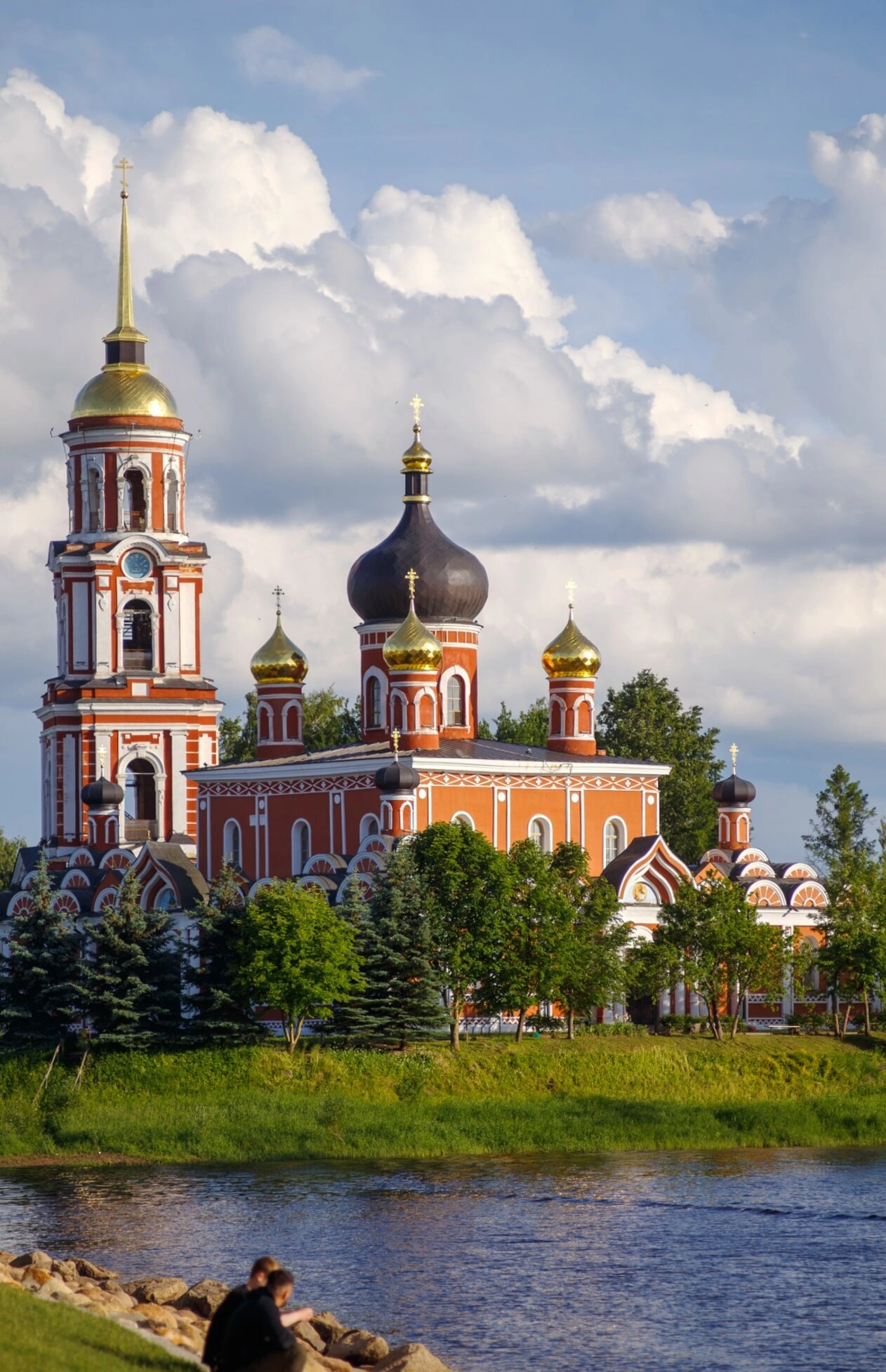 На представленной фотографии запечатлён величественный Воскресенский кафедральный собор, расположенный в древнем городе Старая Русса Новгородской области. Этот православный храм, возвышающийся на живописном берегу реки Полисть, является духовным символом города и одной из его главных святынь.