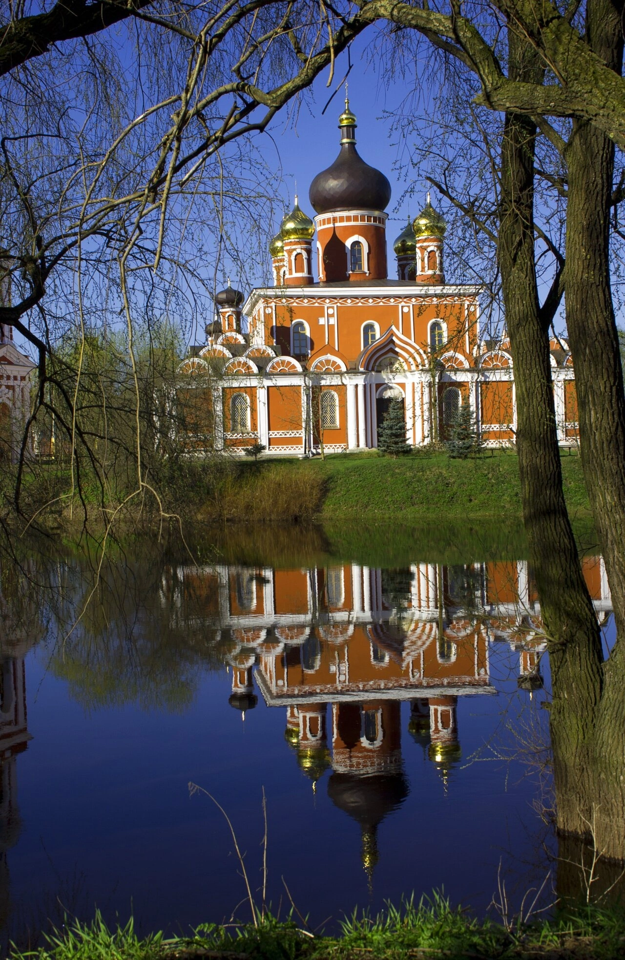 На представленной фотографии запечатлён величественный Воскресенский кафедральный собор, расположенный в древнем городе Старая Русса Новгородской области. Храм живописно отражается в спокойных водах реки Полисть, создавая гармоничный и благолепный образ, символизирующий единение небесной красоты и земного мира.