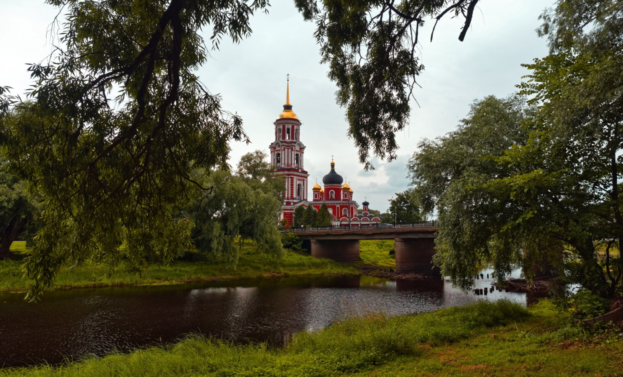 На представленной фотографии запечатлён величественный Воскресенский кафедральный собор, расположенный в древнем городе Старая Русса Новгородской области. Храм живописно возвышается на стрелке рек Полисти и Перерытицы, являясь архитектурной доминантой и духовным сердцем города.