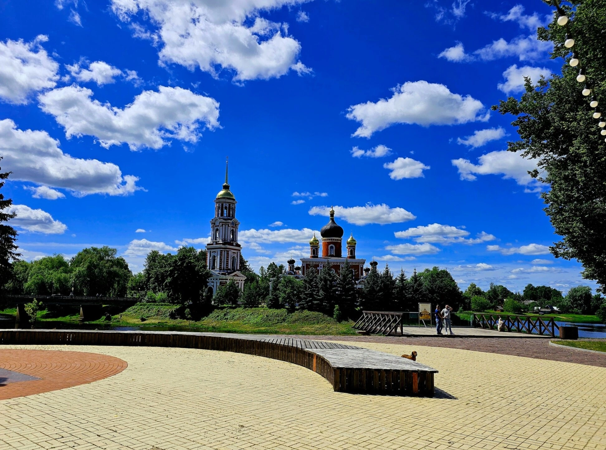 На фотографии запечатлён величественный вид на Воскресенский кафедральный собор и его стройную колокольню, расположенные в древнем городе Старая Русса Новгородской области. Храм стоит на живописном берегу реки Полисть, что придаёт пейзажу особую благодатную атмосферу умиротворения и благости.