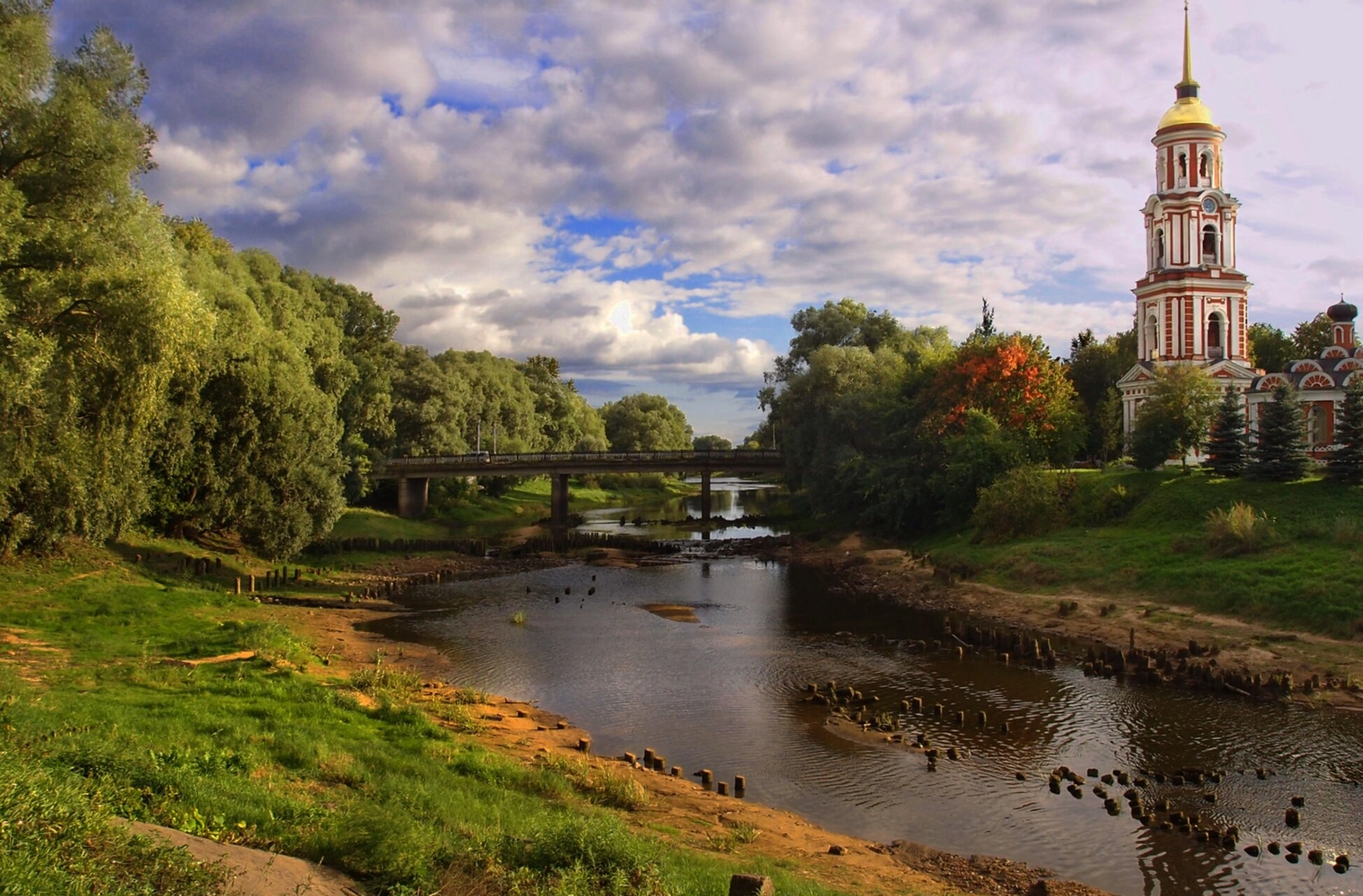 На представленной фотографии запечатлён величественный Воскресенский кафедральный собор, возвышающийся на живописном берегу реки Полисть в древнем городе Старая Русса. Этот православный храм, являющийся архитектурной доминантой города, был возведён в конце XVII века на месте более древней церкви и освящён в честь Светлого Христова Воскресения.