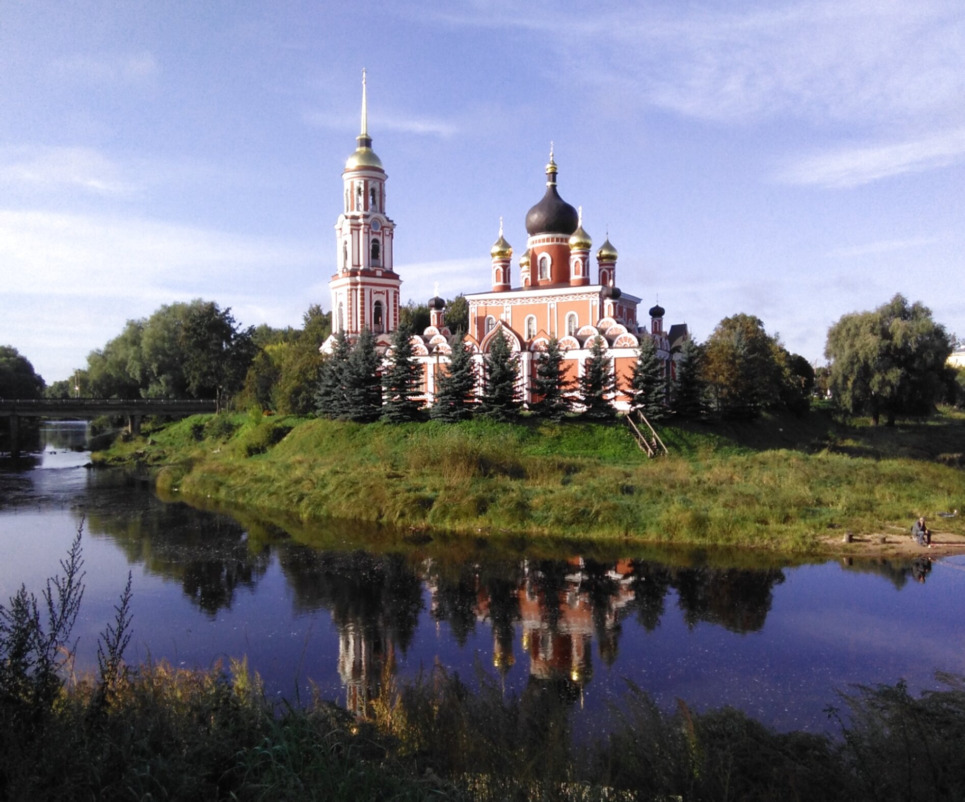 На представленной фотографии запечатлён величественный Воскресенский кафедральный собор, расположенный в древнем городе Старая Русса Новгородской области. Храм живописно возвышается на стрелке рек Полисть и Перерытица, являясь архитектурной доминантой и духовным сердцем города.