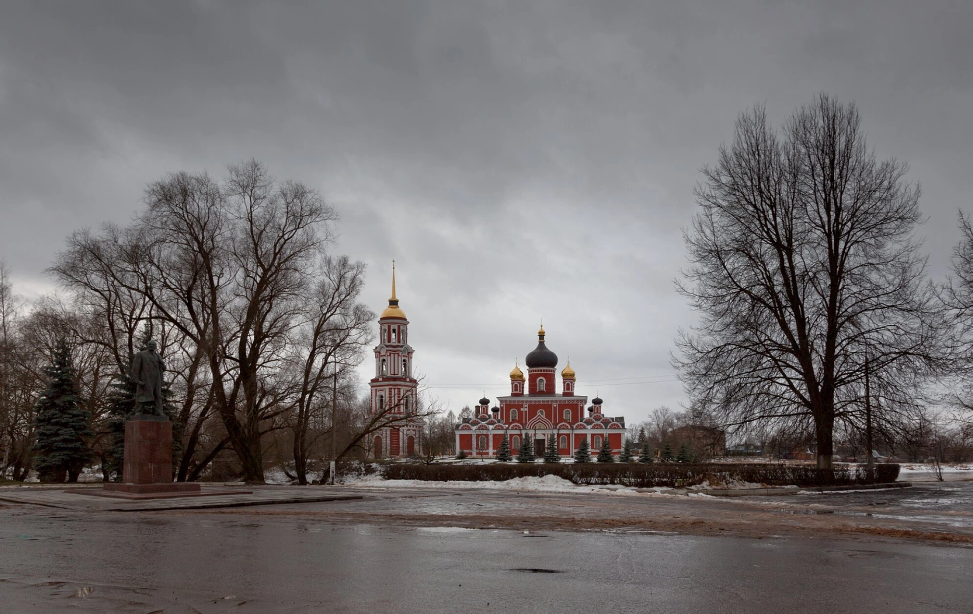 На представленной фотографии запечатлён величественный Воскресенский кафедральный собор, что возвышается на живописном берегу реки Полисть в древнем городе Старая Русса. Храм, освящённый в честь Светлого Христова Воскресения, является духовным центром города и выдающимся памятником церковного зодчества. Его ярко-алые стены и белоснежные декоративные элементы, контрастирующие с тёмными куполами, увенчанными злачёными главками, создают неповторимый архитектурный образ.