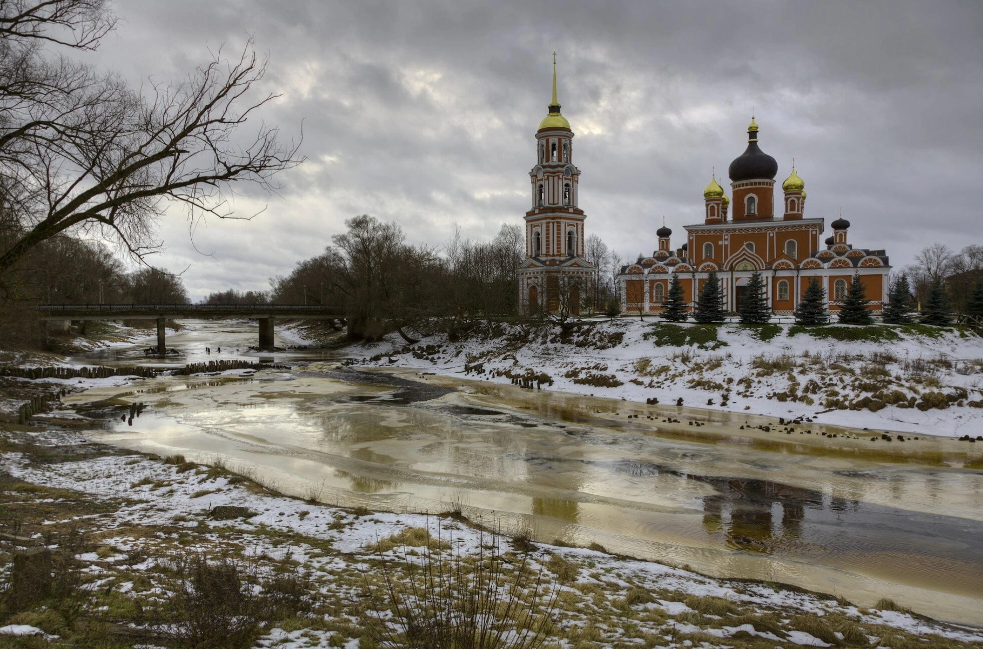 На представленной фотографии запечатлён величественный Воскресенский кафедральный собор, располагающийся в древнем городе Старая Русса Новгородской области. Храм живописно возвышается на берегу реки Полисть, отражаясь в её зимних, подёрнутых льдом водах. Снимок передаёт благоговейную атмосферу русского зимнего пейзажа, подчёркивая монументальность и духовную значимость святого места.