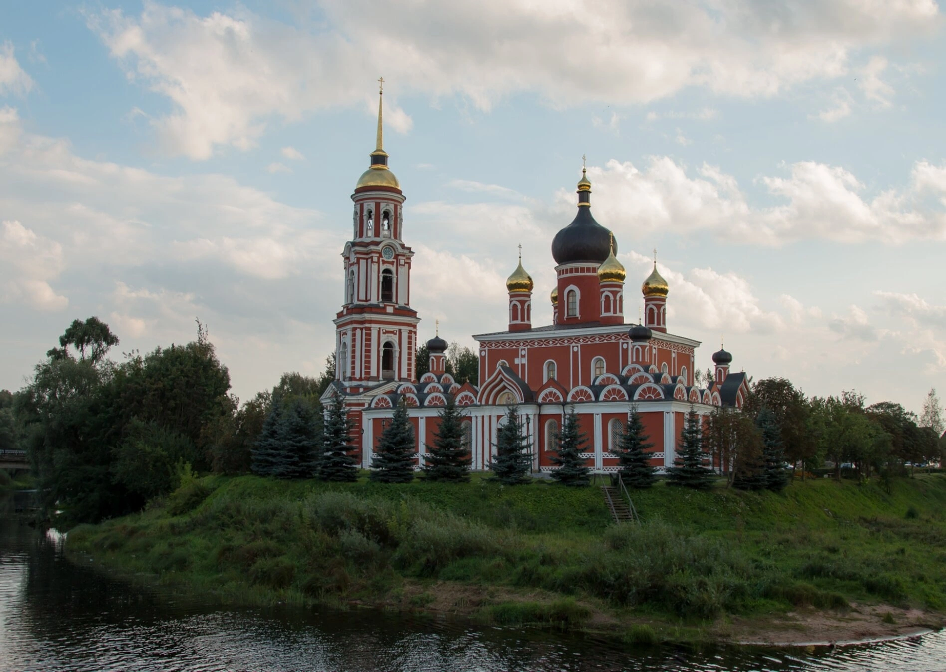 Вид собора с реки открывает один из самых прекрасных и узнаваемых видов Старой Руссы, подчёркивая гармонию божественного творения и природной красоты.