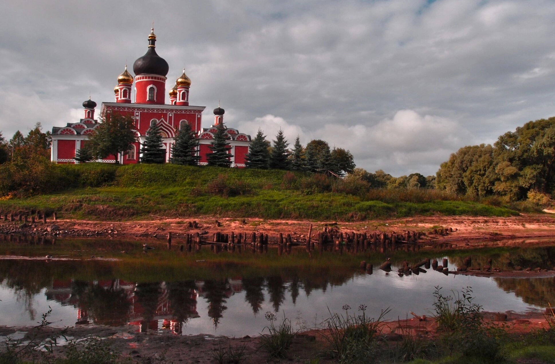 Особую одухотворённость и благодать captured образ собора приобретает благодаря его идеальному отражению в спокойных водах реки Полисть, что создаёт ощущение гармонии между творением рук человеческих и божественной природой. На заднем плане виднеются кроны деревьев и высокое облачное небо, подчёркивающие величие этого святого места. Воскресенский собор является не только выдающимся памятником истории и культуры, но и действующим храмом, где непрестанно возносятся молитвы ко Господу.