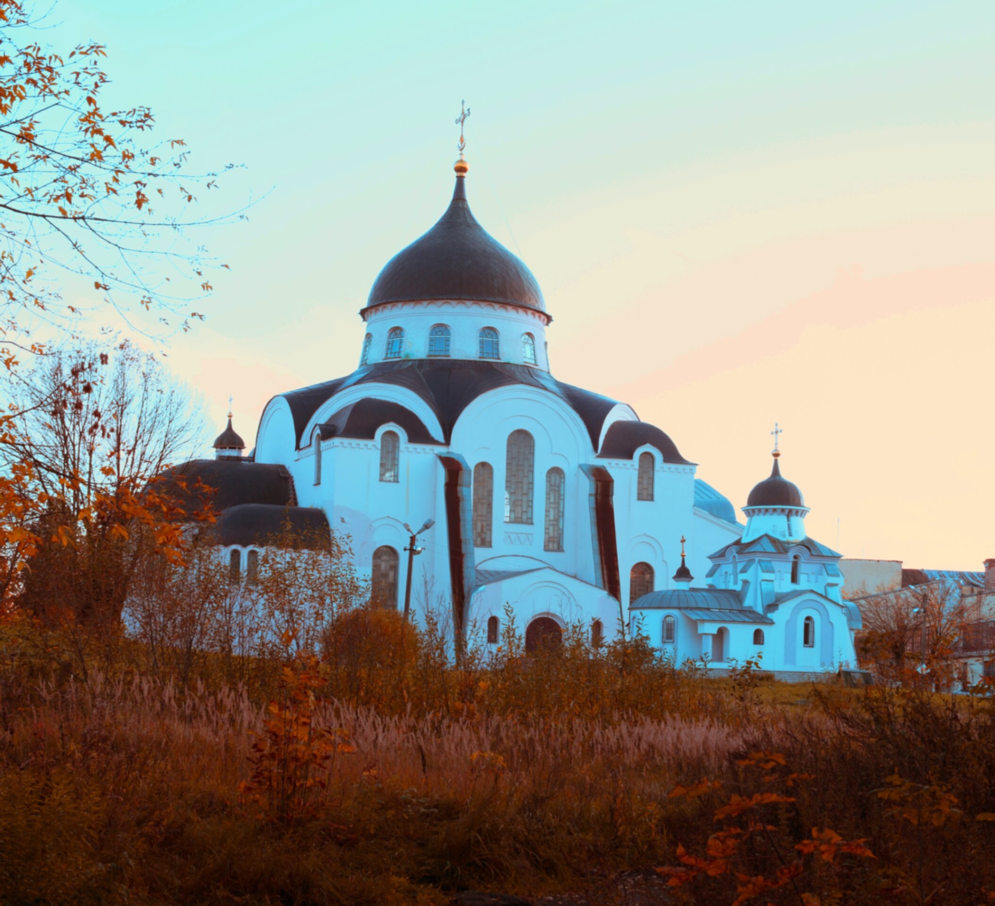 На представленной фотографии запечатлён величественный Воскресенский кафедральный собор, являющийся главным храмом Тверской митрополии и кафедрой митрополита Тверского и Кашинского. Белоснежные стены собора, увенчанные тёмными куполами, эффектно выделяются на фоне осенней природы с пожелтевшей листвой, что придаёт снимку особую атмосферу умиротворения и духовной торжественности.