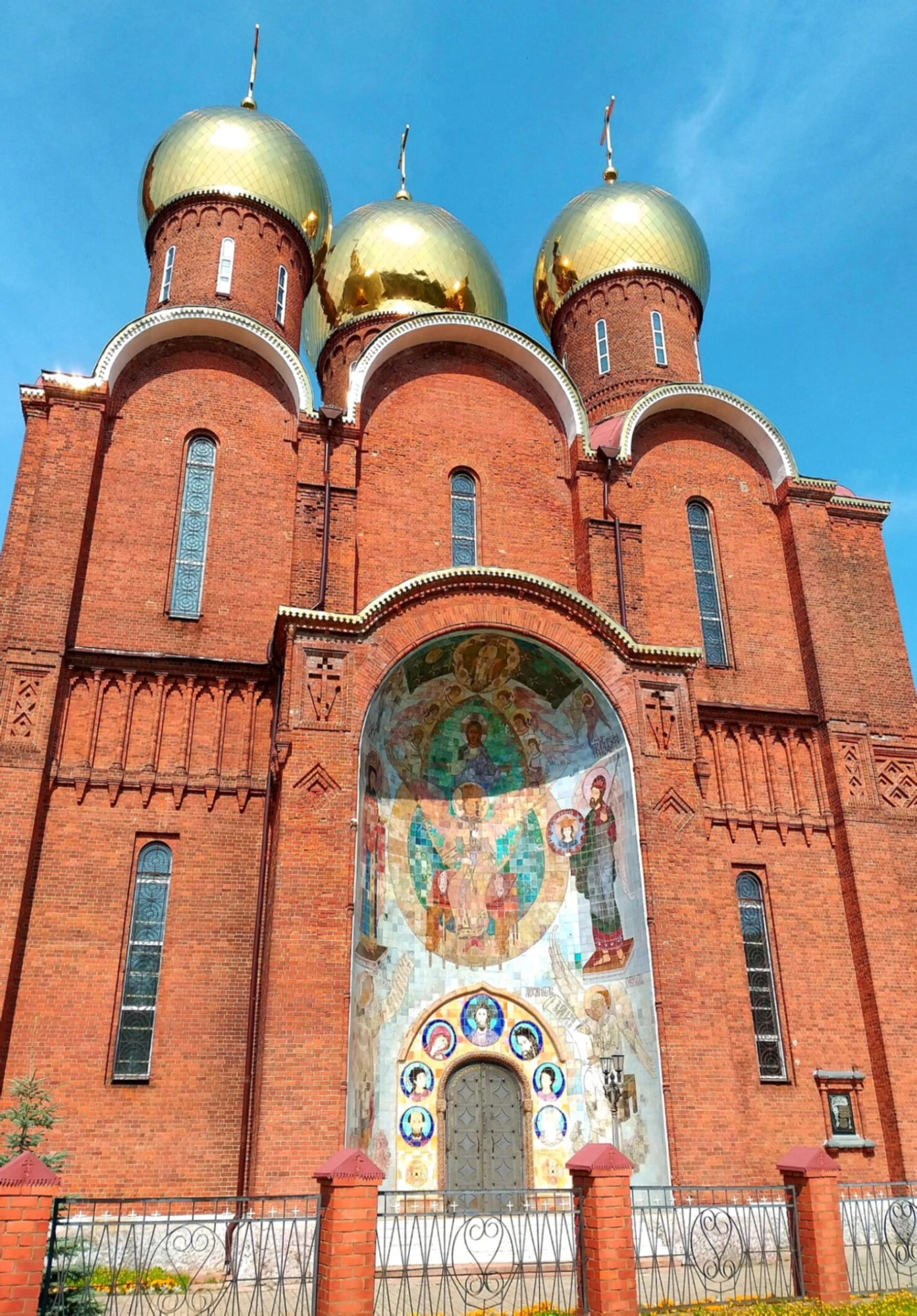 На представленной фотографии запечатлён величественный Воскресенский кафедральный собор, расположенный в городе Вичуга Ивановской области. Этот выдающийся православный храм, также известный в народе как «Красная церковь» из-за материала постройки, является архитектурной доминантой города и объектом культурного наследия.