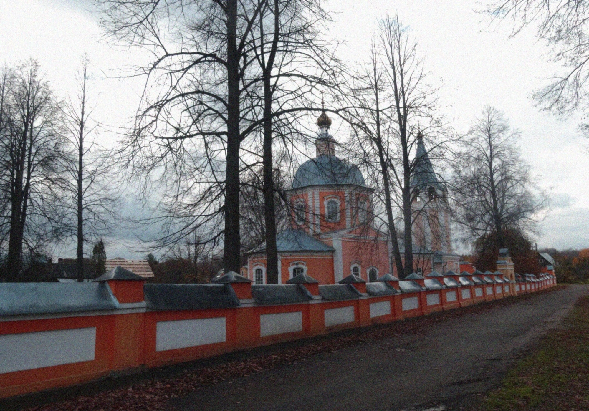 Монастырский комплекс окружён невысокой оградой, выкрашенной в охристые тона с белыми декоративными элементами, что символизирует чистоту и духовное устремление ввысь. Прилегающая территория облагорожена, вдоль ограды пролегает грунтовая дорога, ведущая к святым вратам обители.