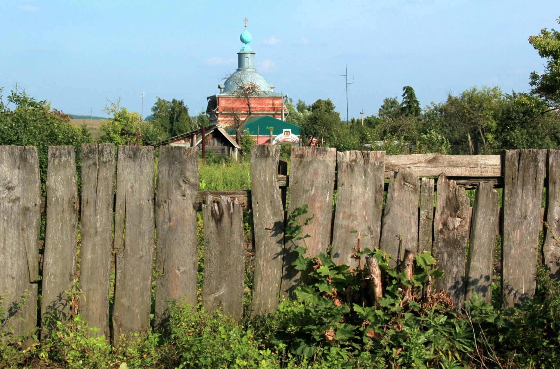 На представленной фотографии запечатлён величественный Воскресенский собор, являющийся архитектурной доминантой исторического центра города Венёва Тульской области. Кадр выстроен таким образом, что здание храма, виднеющееся на заднем плане, эффектно контрастирует со скромным деревянным забором на переднем плане, что символично подчёркивает связь земного и горнего миров.