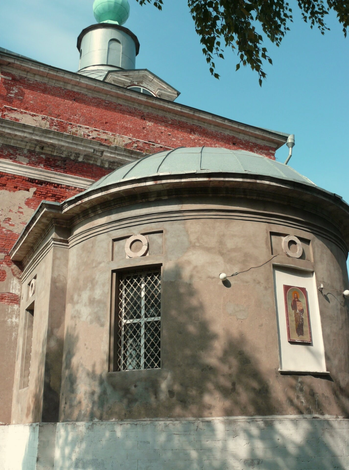 Верхняя часть здания, выполненная из красного кирпича, гармонично сочетается с оштукатуренными фрагментами фасада, создавая характерный для русской церковной архитектуры облик. Центральное место на изображении занимает оконный проём, украшенный ажурной кованой решёткой и увенчанный декоративным элементом. Над окном располагается круглая ниша, предназначенная для размещения иконы, что является традиционным решением в оформлении храмовых сооружений.
